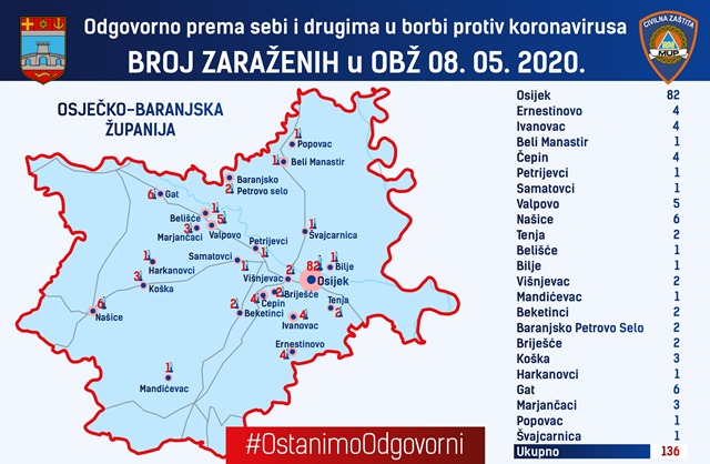 Dvije novooboljele osobe su s područja Našica, a ostali iz Osijeka, Marjančaca, Popovca i Švajcarnice. Ukupan broj oboljelih na području županije od početka pandemije tako je povećan na 136 osoba.