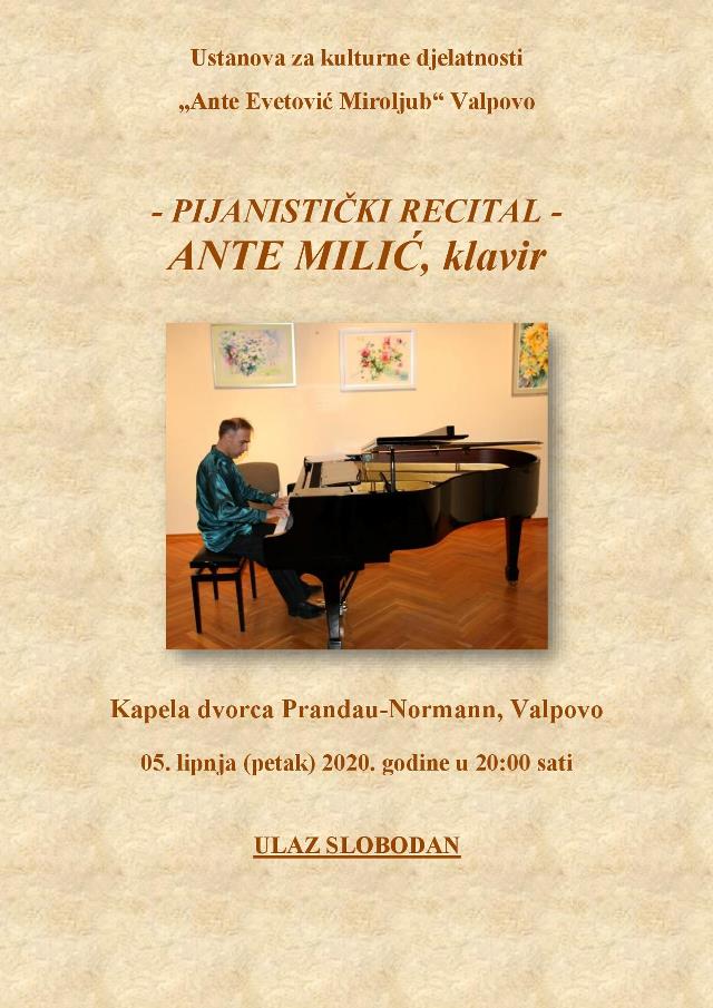 VALPOVO Ustanova za kulturne djelatnosti „Ante Evetović Miroljub“ Valpovo organizator je pijanističkog recitala Ante Milića, klavir.