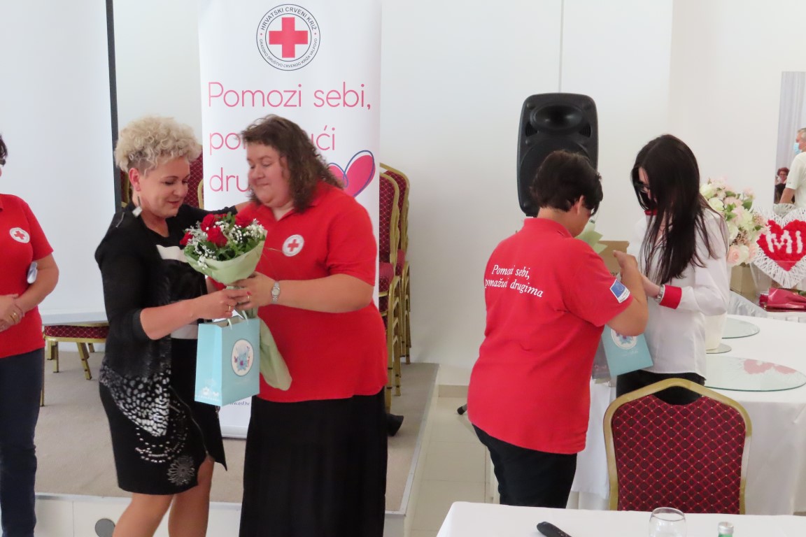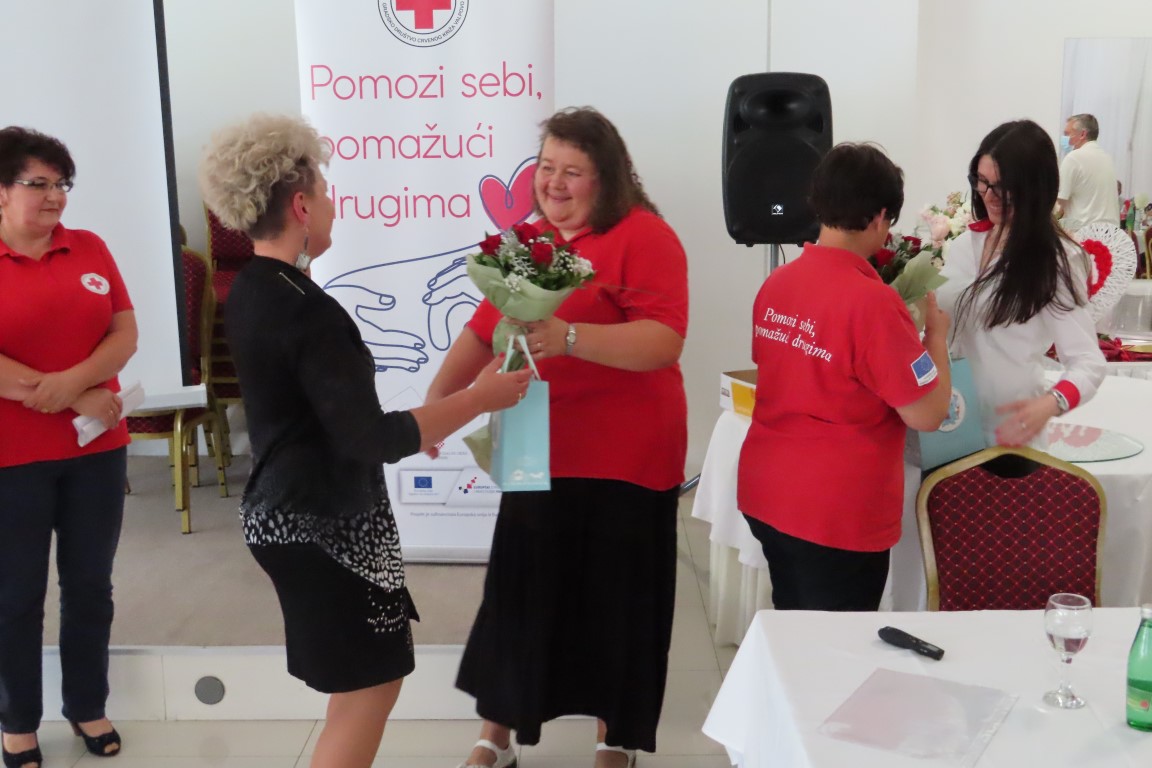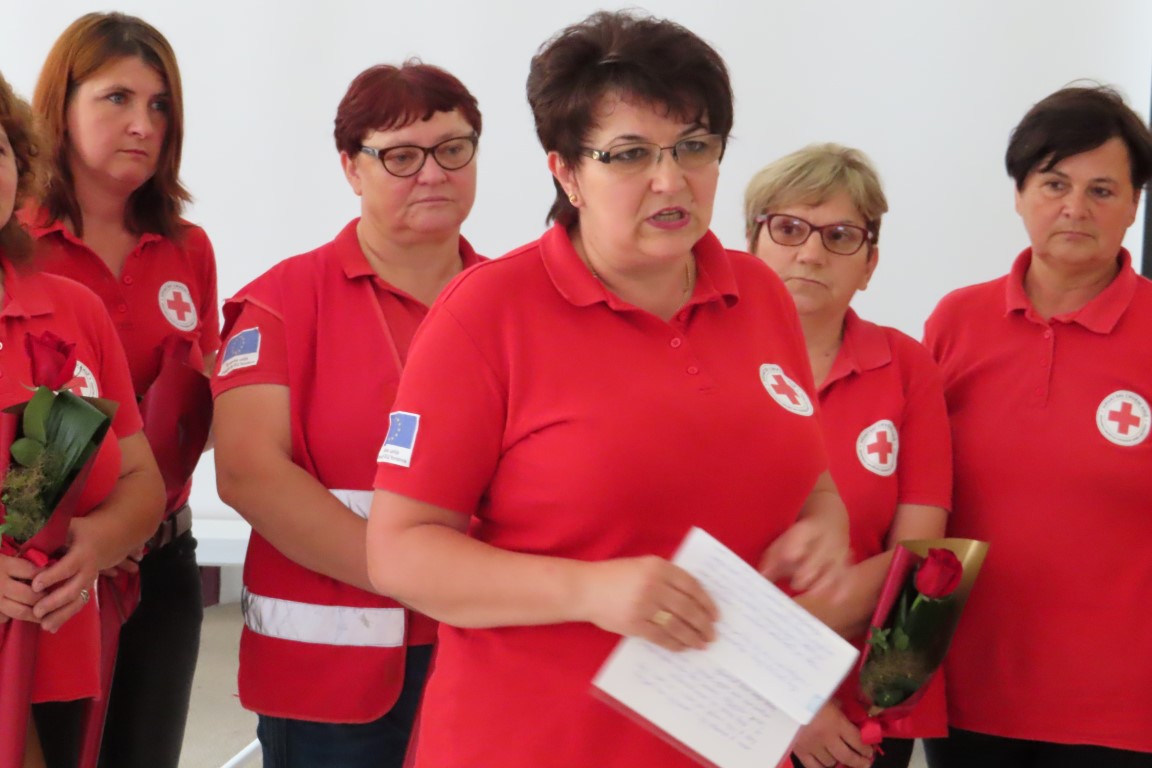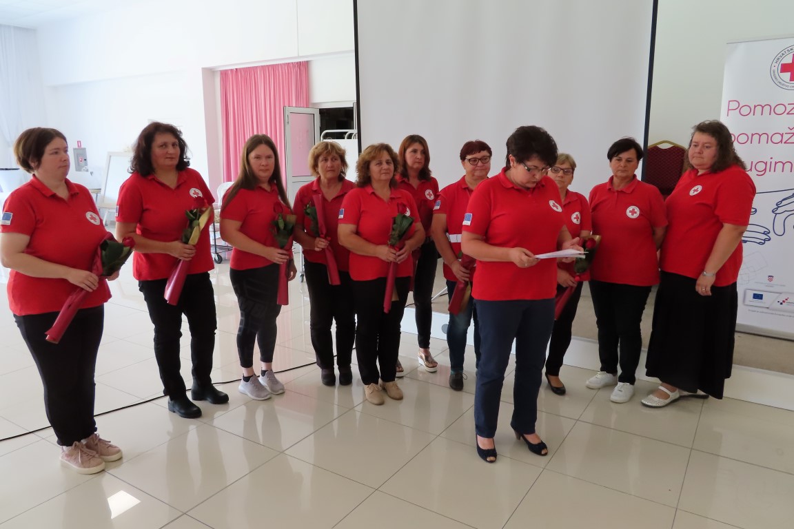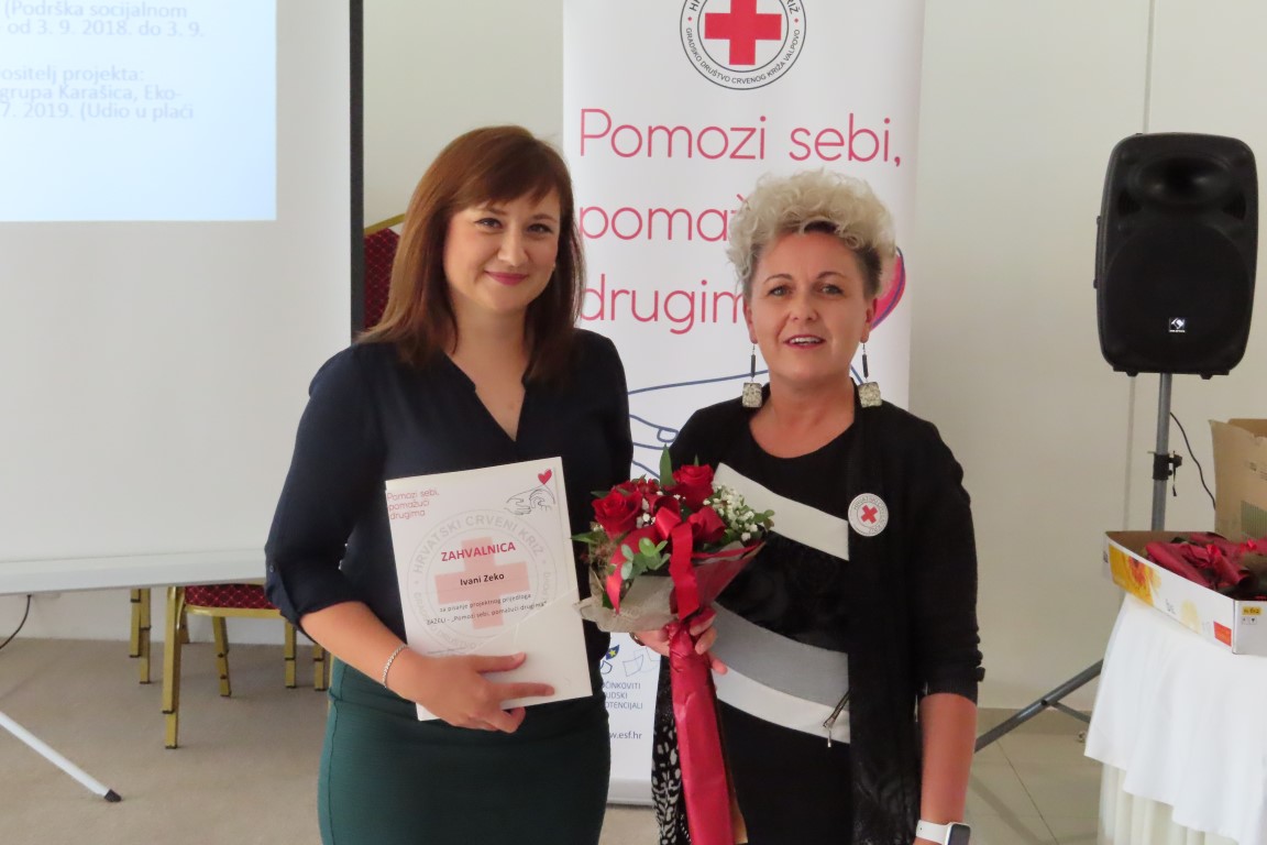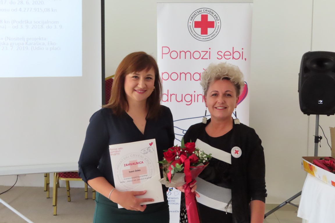 Posebnu zahvalu uputila je svim zaposlenim gerontodomaćicama koje su se pune dvije godine u potpunosti predale najhumanijem činu, a to je pomoć drugima, i bez kojih ovaj projekt ne bi imao značenje koje danas ima. Krajnjoj korisnici iz Belišća gđi. Mileni Glasovac koja nam se obratila s par prigodnih riječi i korisniku iz Valpova, što su nam ukazali povjerenje u protekle dvije godine provedbe projekta i svojom nazočnošću uveličali završnu svečanost dajući joj puno veće značenje. Svim partnerima koji su pomogli u njegovu stvaranju i provedbi te svim zaposlenicima Gradskog društva Crvenog križa Valpovo koji su sa ljubavlju i osmjehom na licu pratili njegovu provedbu. Na samom kraju ravnateljica GDCK Valpovo osobito je zahvalila za pisanje projektnog prijedloga tadašnjoj direktorici LRA, Lidiji Maurović Košćak i Ivani Zeko te je uručila zahvalnice i prigodne znakove pažnje svim partnerima i zaposlenim gerontodomaćicama, dok su one u znak pažnje i zahvalnosti prekrasnim buketom i šalicom sa simoboličnim otiskom u znak sjećanja darivale ravnateljicu GDCK Valpovo i voditeljicu projekta Tamaru Katalinić.