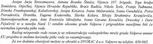 VALPOVO Dvorac d.o.o. kao isporučitelj vodnih usluga obavještava da će sutra, u četvrtak 17. prosinca 2020. godine u vremenu od 8:00 do 12:00 sati zbog radova na rekonstrukciji vodovodne mreže doći do prekida u isporuci vode u dijelu grada Valpova.