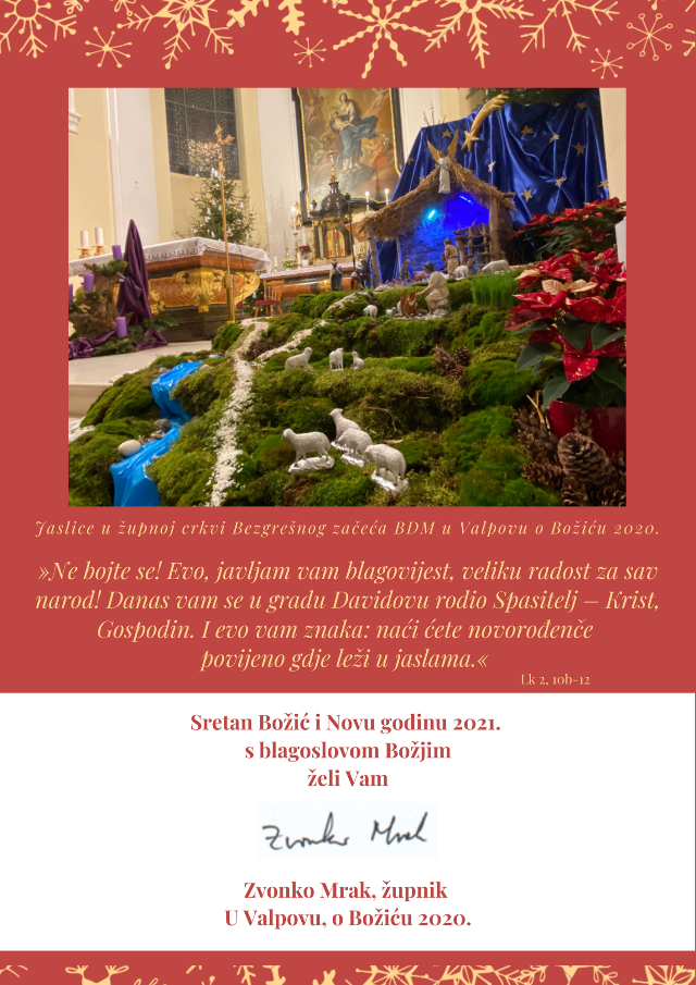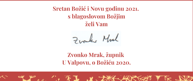 VALPOVO Zvonko Mrak, župnik Župe Bezgrešnog začeća Blažene Djevice Marije u Valpovu uputio je vjernicima prigodnu čestitku.