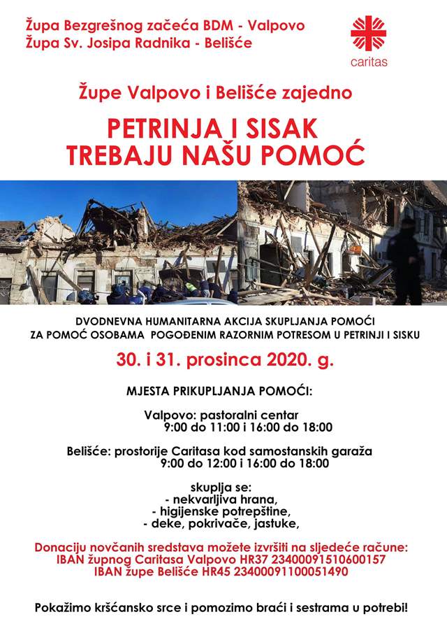 BELIŠĆE/VALPOVO Župa Sv. Josipa Radnika Belišće i Bezgrešnog začeća Blažene Djevice Marije udružile su se u humanitarnoj akciji prikupljanja pomoći stradalima u potresu.