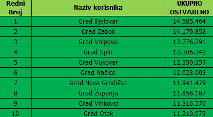 Analizirajući gradove, ukupno je kroz prvu i drugu fazu najviše sredstava ugovorio Grad Bjelovar, 14,5 milijuna kuna, slijedi Grad Zabok s ugovorenih oko 14,1 milijun, Valpovo 13,7 milijuna, Split 13,3 milijuna kuna, Vukovar 12,3 milijuna, Našice 12, Nova Gradiška 11,9 milijuna, Županja 11,8, Vinkovci 11,3 i Grad Otok 11,2 milijuna kuna.