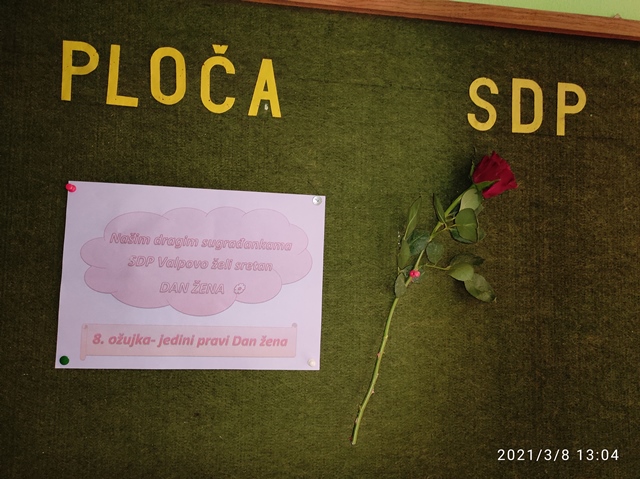 Tako su i danas aktivisti Gradske organizacije SDP-a Valpovo, predvođeni predsjednikom Miroslavom Šmitom i potpredsjednikom Darkom Tivanovcem obišli zaposlene žene u Centru za socijalnu skrb, Domu zdravlja Valpovo, HRV- u, Županijskim službama u Mimozi, kao i slučajne prolaznice na gradskim ulicama, čestitali im Dan žena i skromno ih darivali sa po jednim cvijetom ruže.
