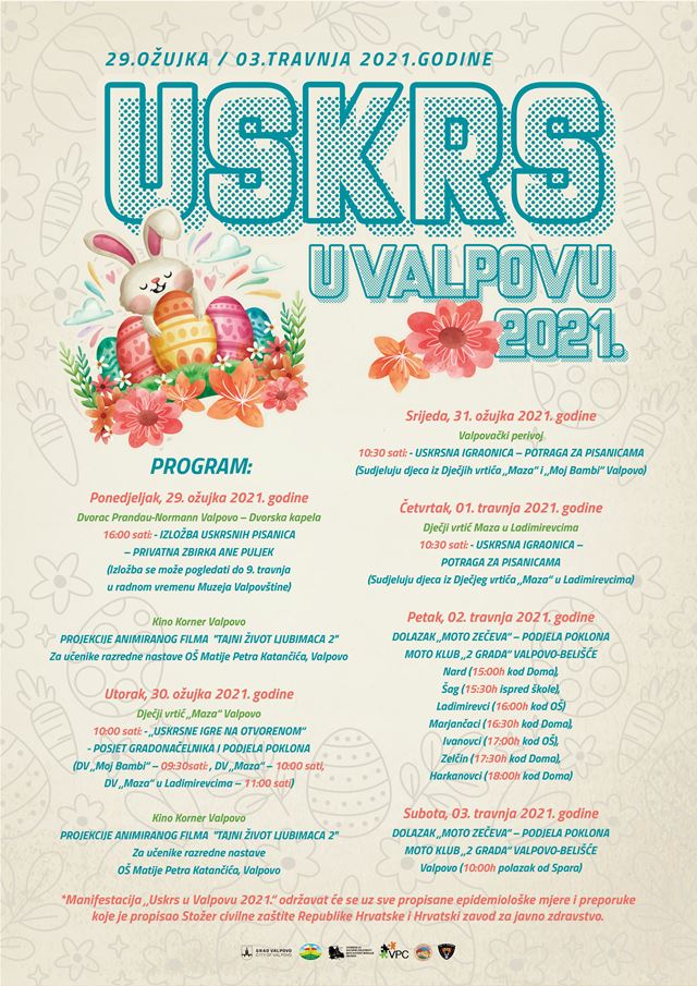 *Manifestacija „Uskrs u Valpovu 2021.“ održavat će se uz sve propisane epidemiološke mjere i preporuke koje je propisao Stožer civilne zaštite Republike Hrvatske i Hrvatski zavod za javno zdravstvo.*