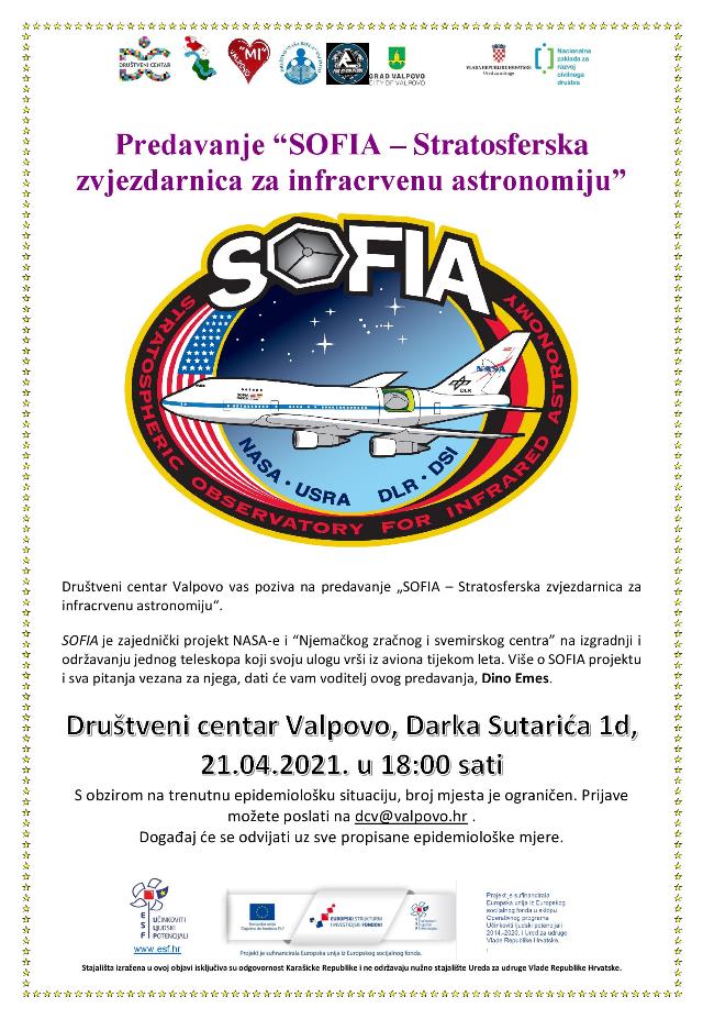 U prostorijama Društvenog centra Valpovo, u srijedu 21. travnja 2021. u 18 h održava se predavanje „SOFIA – Stratosferska zvjezdarnica za infracrvenu astronomiju“.