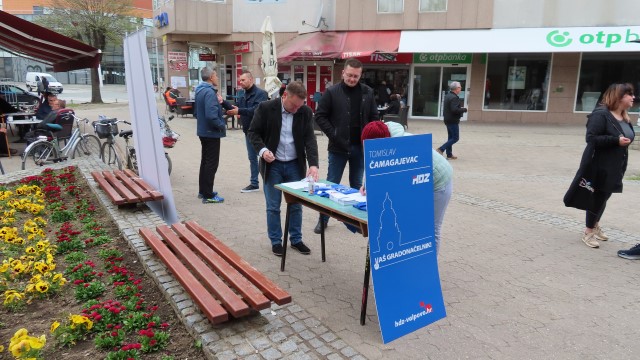 Na jednom štandu između prodavaonice Konzum i zgrade bivše Robne kuće ARCA su članovi i simpatizeri Hrvatske demokratske zajednice skupljali potpise potpore za kandidaturu Tomislava Čamagajevca za gradonačelnika Valpova, a na drugom su članovi i simpatizeri Domovinskog pokreta skupljali potpise za kandidaturu za osječko-baranjsku županicu Vesnu Vučemilović.