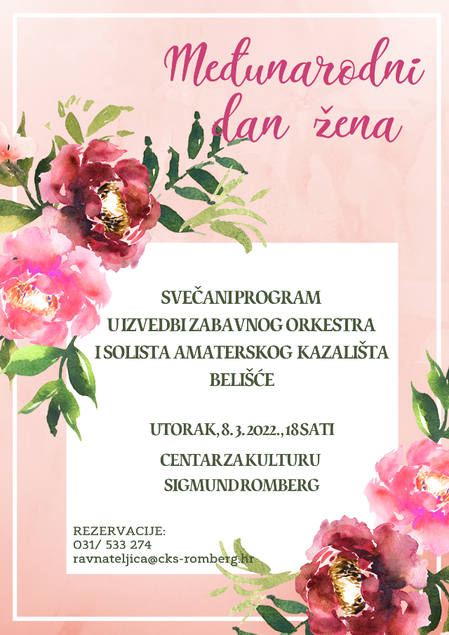Tradicionalni svečani program u izvedbi Zabavnog orkestra i solista Amaterskog kazališta Belišće održat će se u utorak, 8. ožujka 2022. godine, s početkom u 18 sati u Centru za kulturu Sigmund Romberg Belišće.