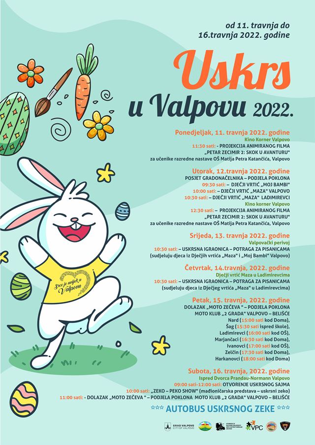 VALPOVO Turistička zajednica Grada Valpova Grad Valpovo, Valpovački poduzetnički centar, Ustanova za kulturne djelatnosti „Ante Evetović Miroljub“ Valpovo organizatori su programa Uskrs u Valpovu od 11 do 16. travnja.