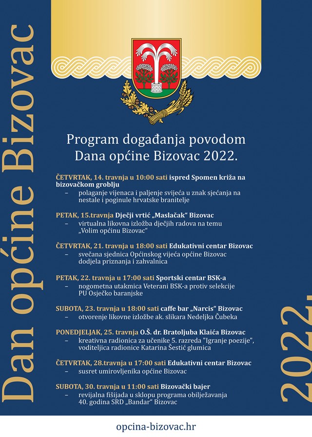 BIZOVAC Općina Bizovac pripremila je bogat program obilježavanja Dana Općine od 14. do 30. travnja 2022. godine.