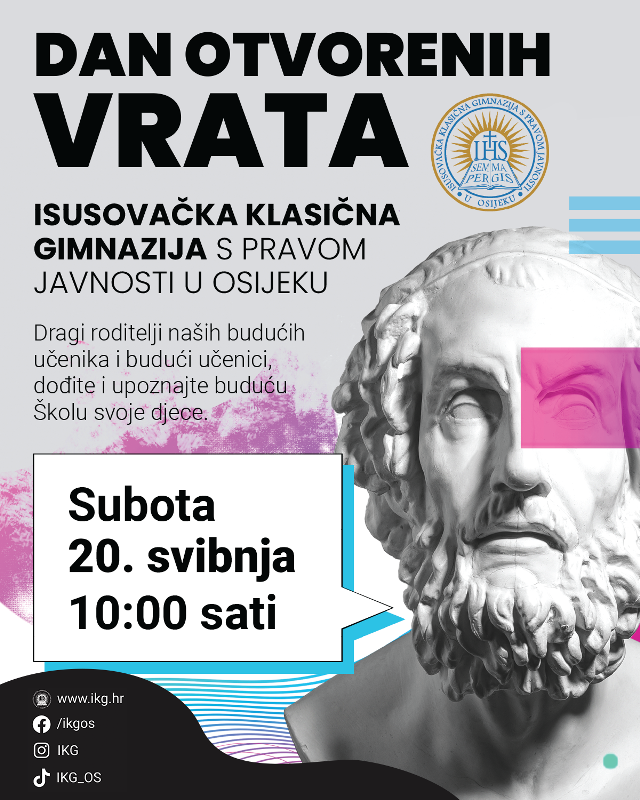 OSIJEK U subotu 20. svibnja 2023. s početkom u 10 sati, Isusovačka klasična gimnazija u Osijeku priređuje Dan otvorenih vrata na Trgu Vatroslava Lisinskog 1.