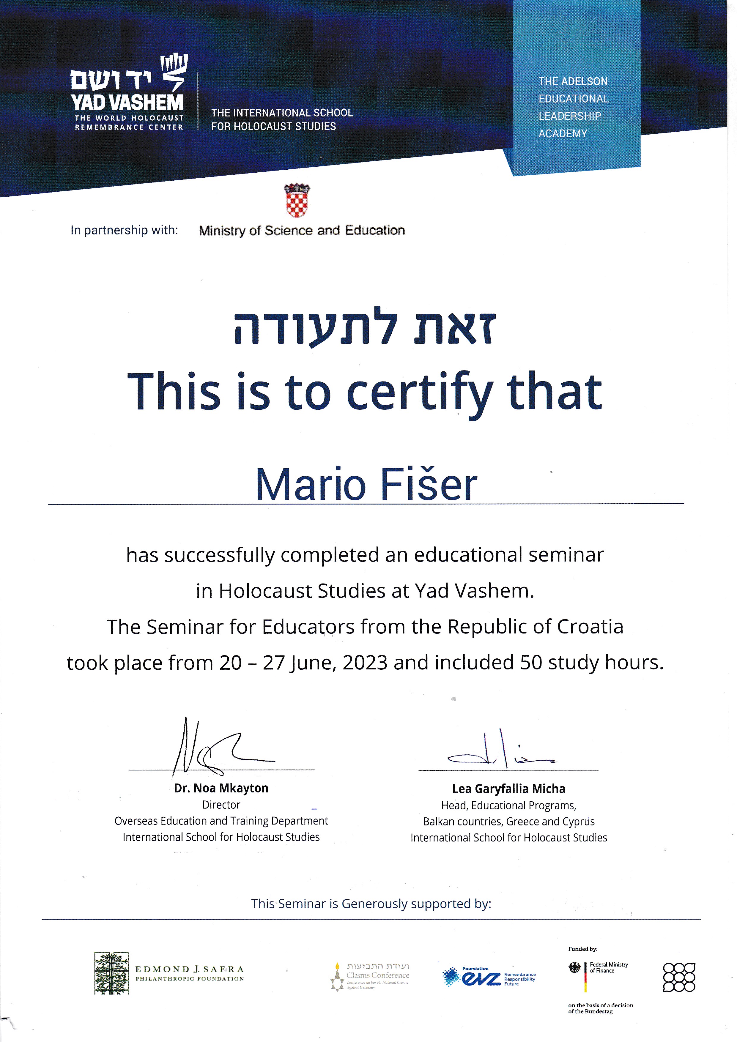 Kako je priopćila Općina Bizovac, nakon što mu je dodijeljena stipendija Ministarstva znanosti i obrazovanja za edukaciju o poučavanju o holokaustu od 20. do 27. lipnja 2023. godine u Jeruzalemu je boravio i Mario Fišer, profesor povijesti u Osnovnoj školi Bratoluba Klaića, Bizovac i predstavnik Općine Bizovac.
