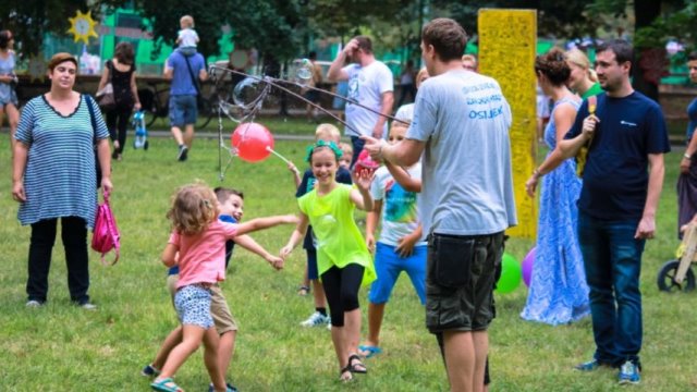 Očekuje vas čak 19 različitih radionica za sve generacije – od hodanja na štulama, klaunske školice, čitanja bajki, čajanke s princezama, oslikavanja velike zastave djece, izrade zdravih zalogaja i napitaka u dječjem restoranu Ernestina, izrade svijeća i predmeta od gline, slika od mahovine, crtanja klorofilom, učenje starih zanata, do plesa, sportskih igara i 3D modeliranja. Izvoditelji radionica dolaze iz Hrvatske i Mađarske.