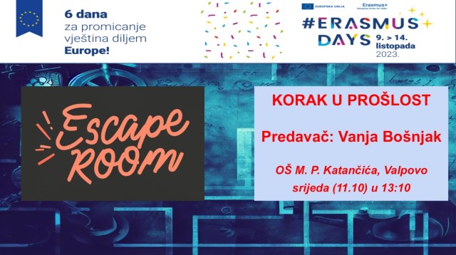Srijeda (11.10.) donosi radionicu "Korak u prošlost (Escape room)" s početkom u 13:10. Učenici će se suočiti s neobičnim zadacima, puzzle-ima, kodovima i tajnim porukama te se uhvatiti u koštac s prošlošću grada Valpova. Radionica će potaknuti razvoj vještina rješavanja problema, kritičkog razmišljanja, komunikacije i timskog rada.