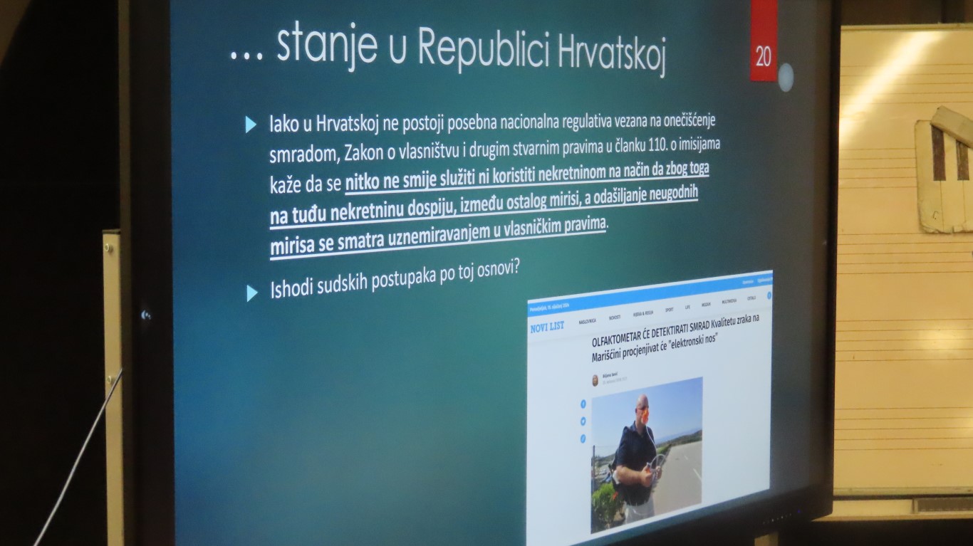 Prisustvo neugodnih mirisa u zajednici je također pitanje nepoštivanja okolišne pravde, istaknula je dr. sc. Runko Luttenberger i pritom ustvrdila da u Republici Hrvatskoj još uvijek ne postoji regulativa koja se bavi neugodnim mirisima, iako Zakon o vlasništvu i drugim stvarnim pravima sadrži odredbu o imisijama koja kaže da se nitko ne smije služiti ni koristiti nekretninom na način da zbog toga na tuđu nekretninu dospiju, između ostalog mirisi, a odašiljanje neugodnih mirisa se smatra uznemiravanjem u vlasničkim pravima.