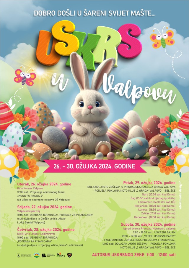 VALPOVO Turistička zajednica Grada Valpova sa suorganizatorima uvodi vas u šareni svijet mašte od 26. - 30. ožujka 2024. godine.