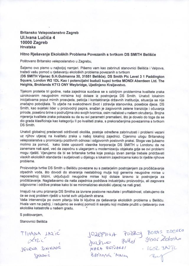 BELIŠĆE „Ispoštujte dostojanstvo što nam pripada Ustavom RH“, poziv je koji je grupa građana Belišća ovih dana uputila Britanskom veleposlanstvu u Zagrebu i tvrtki Mondi, vezano uz učestalu pojavu smrada u Belišću.