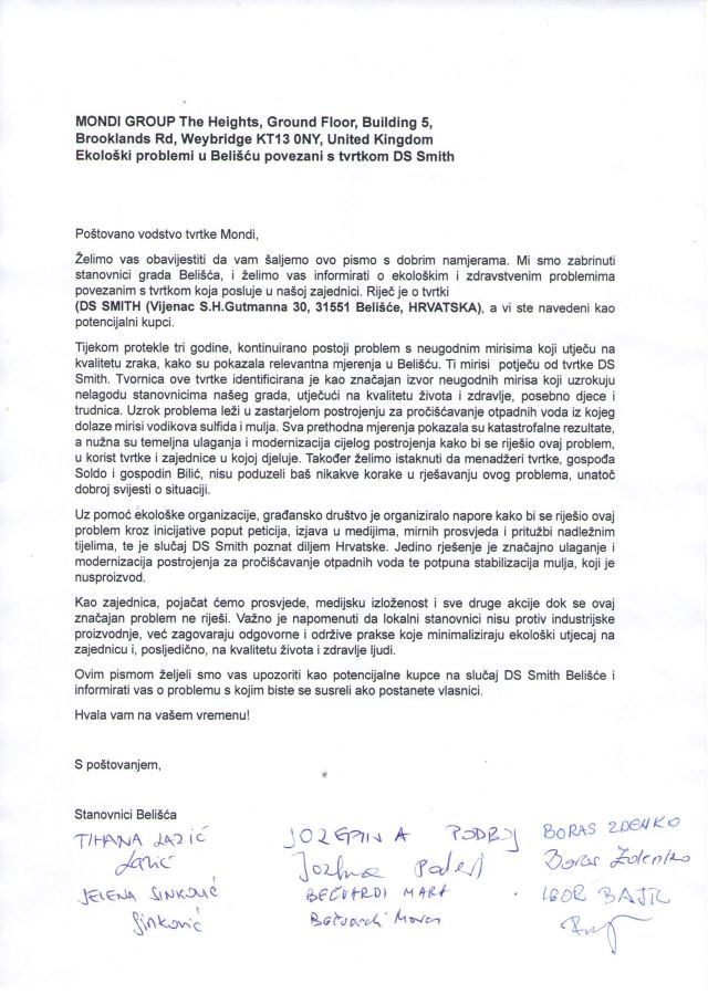 -Oni koji danas rukovode gospodarskim sustavom DS Smith, žele odgovornost smrada (Sumporovodika i nestabiliziranog mulja) u Belišću prebaciti na majke i očeve koji se bore za zdravlje svoje djece prozivajući ih da žele ukinuti radna mjesta. Proces proizvodnje i obrade starog papira u Belišću je zastario i ne poštuje Ekološke standarde.