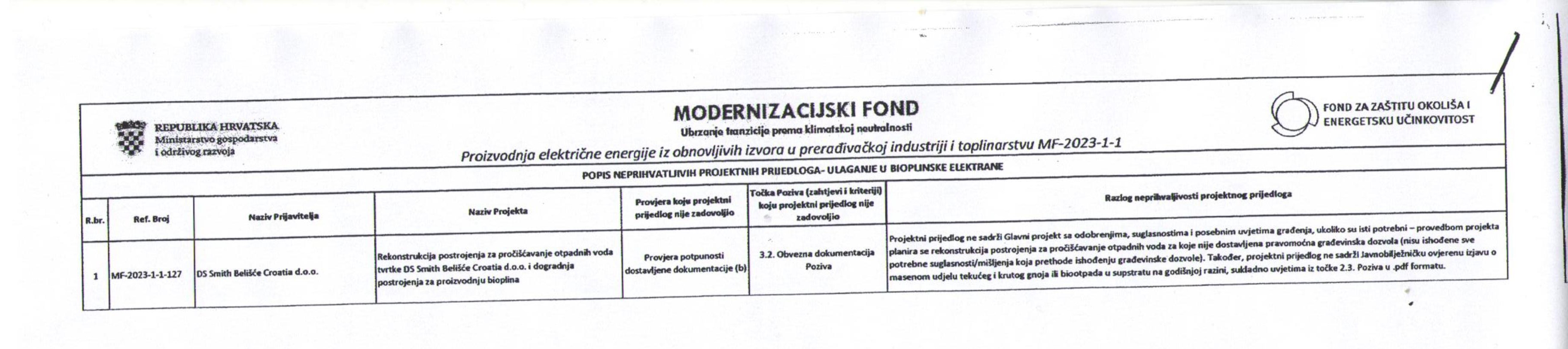 Na stranicama MINISTARSTVA GOSPODARSTVA (javno dostupan dokument) u prosincu 2023. godine objavljen je popis neprihvatljivih projektnih prijedloga. DS Smith Belišće tražio je od MODERNIZACIJSKOG FONDA sufinanciranje rekonstrukcije postrojenja za pročišćavanje otpadni voda. Odbijeni su jer projektni prijedlog ne sadrži Glavni projekt s odobrenjima, suglasnostima i posebnim uvjetima građenja.