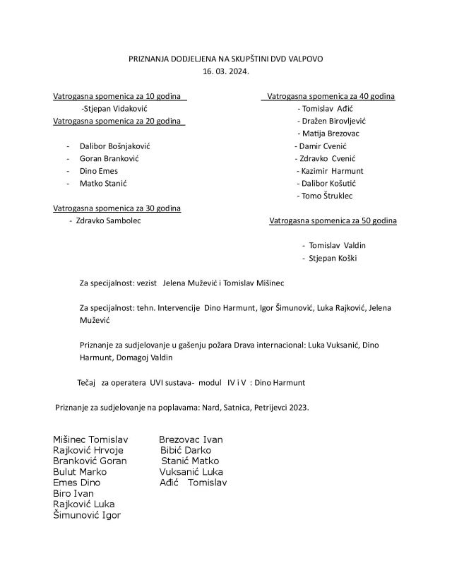 Na najsvečanijem dijelu sjednice skupštine pročitani su dobitnici spomenica, uvjerenja za osposobljavanje te zahvalnice za sudjelovanje članovima koji su svoj doprinos dali na aktivnostima obrane od poplava kao i onima koji su sudjelovali na velikom požaru Drave International u listopadu prošle godine.