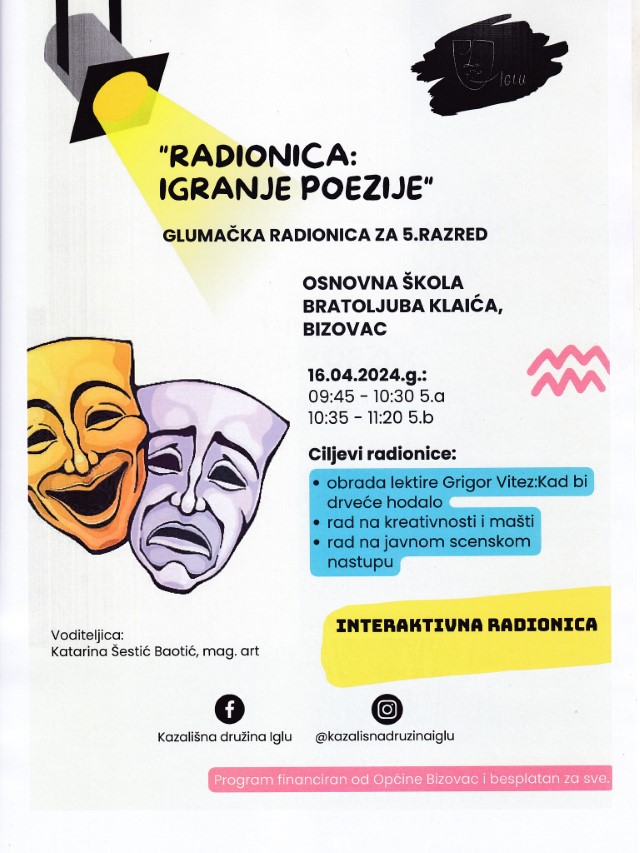 U bizovačkoj osnovnoj školi 16. travnja prije podne održat će se besplatna radionicu za 5. razrede pod nazivom “Igranje poezije”. Voditeljica ove edukativne i zanimljive radionice je naša poznata mlada glumica Katarina Šestić.