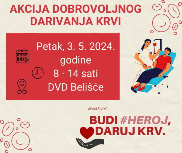 PETAK, 3. 5. 2024. godine u DVD-u Belišće, Željeznička ul. 11, Belišće od 8:00 do 14:00 sati.