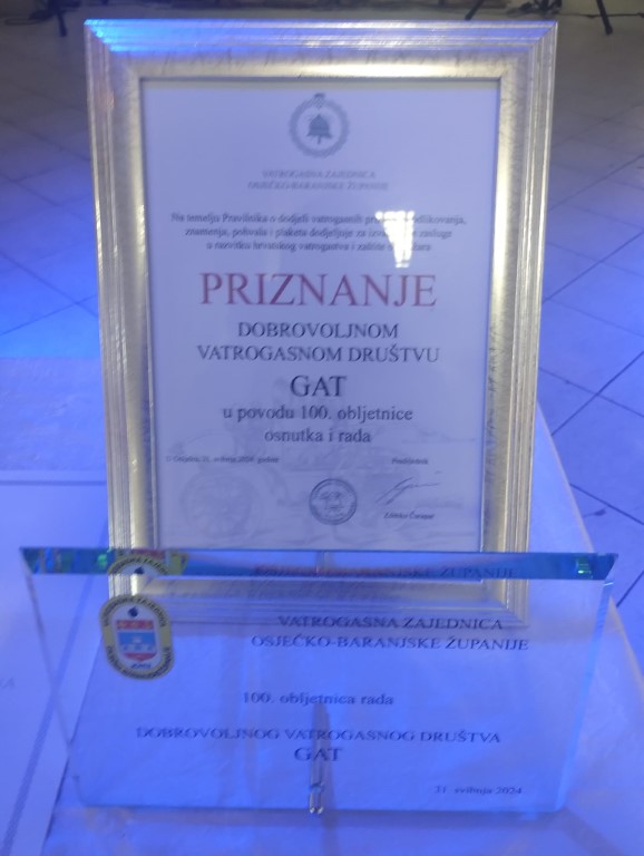 Članovi Dobrovoljnog vatrogasnog društva GAT te brojni predstavnici dobrovoljnih vatrogasnih društava s područja Vatrogasnoj zajednici grada Belišće okupili su se u petak 31. svibnja 2024. godine, u prostoru sale „Melani“ u Gatu, uz brojne predstavnike prijateljskih dobrovoljnih vatrogasnih društava s područja Osječko-baranjske županije, uzvanike, suradnike, članove udruga i svih ostalih koji su pridonijeli radu i razvoju vatrogastva u mjestu Gatu. Razlog njihova sastajanja bio je osobito svečan i poseban, proslava značajne obljetnice: velikih i vrijednih 100 godina postojanja i djelovanja Dobrovoljnog vatrogasnog društva Gat.