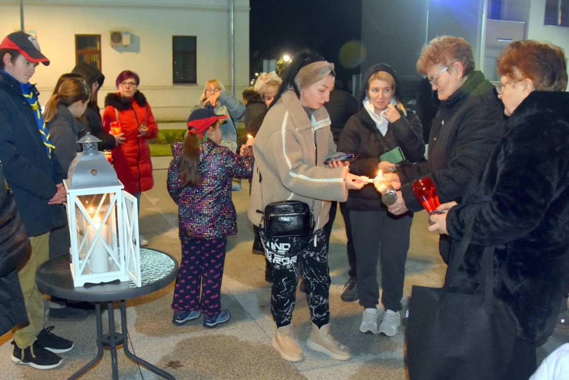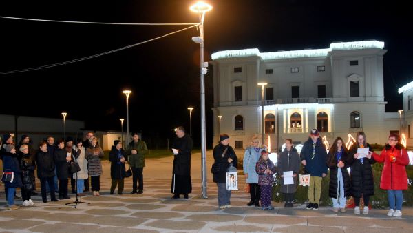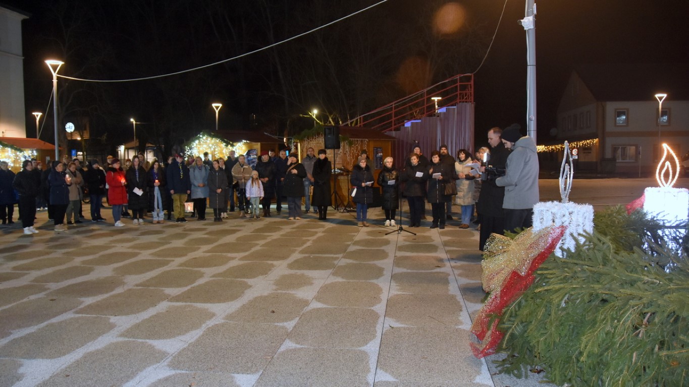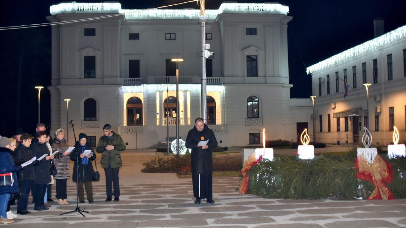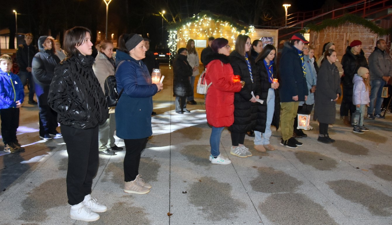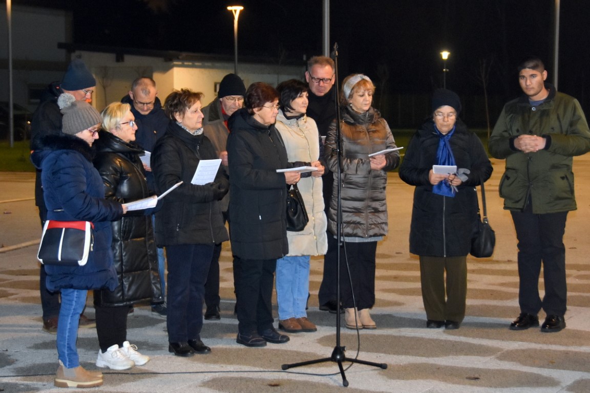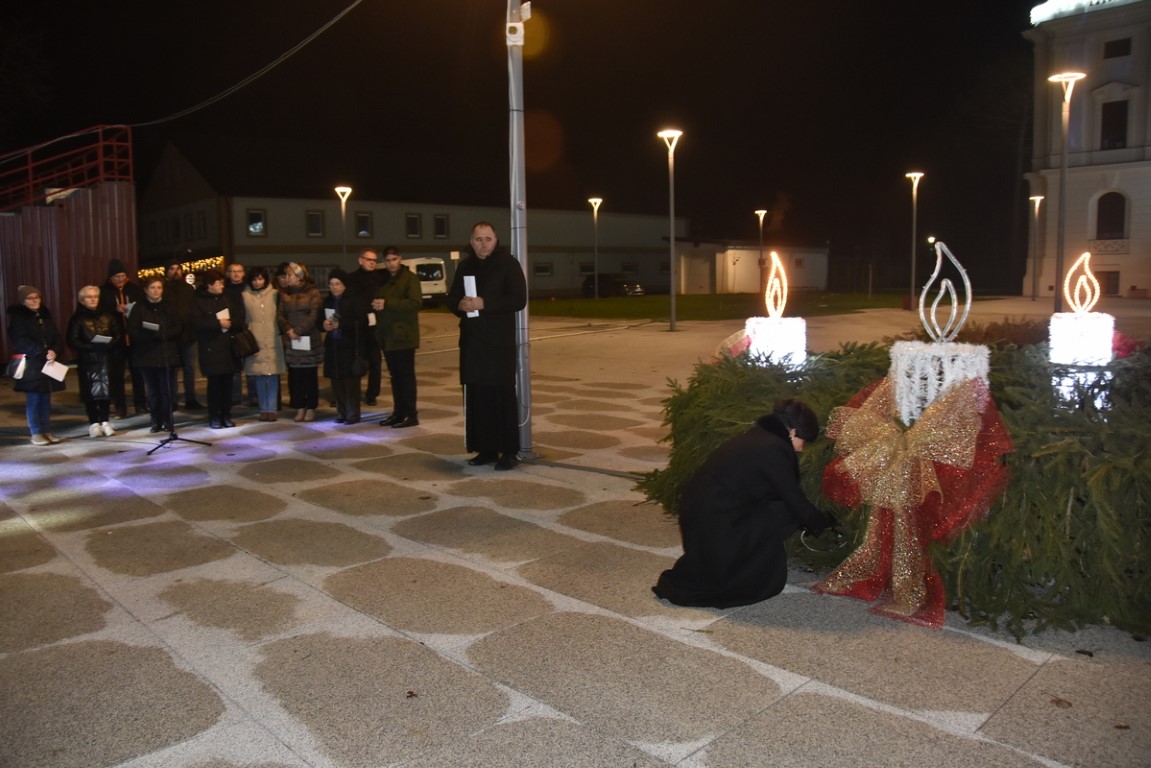 Uz stilizirani adventski vijenac ispred Paleja molitvu je poveo fra Tomislav Sabađija, đakon Župe Sv. Josipa Radnika u Belišću i usmjerio je na obitelji stradalih, a nekoliko je prigodnih napjeva izveo Župni zbor.