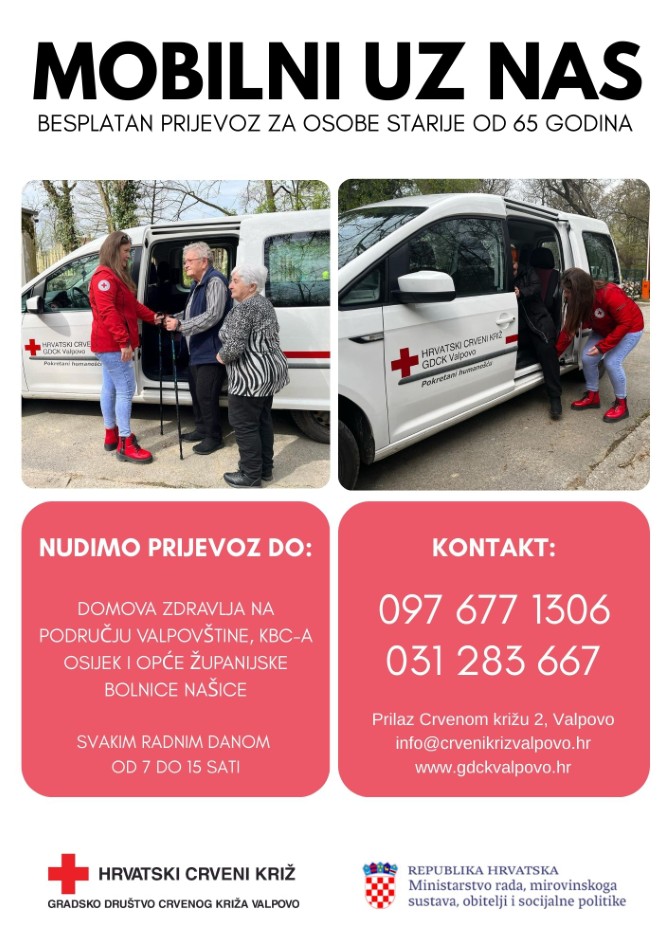 VALPOVO Gradsko društvo Crvenog križa Valpovo započelo je s novim projektom "Mobilni uz nas", koji nudi usluge prijevoza za osobe starije od 65 godina.