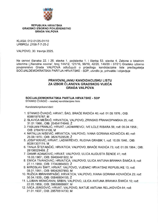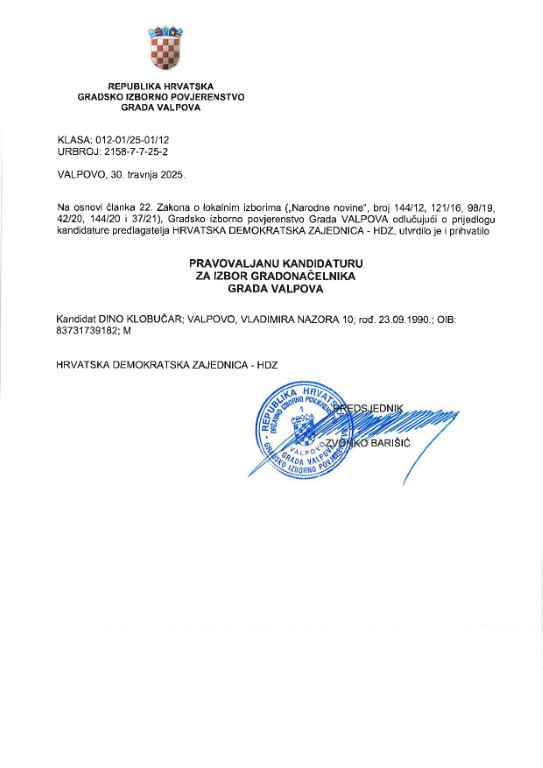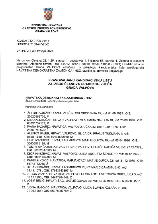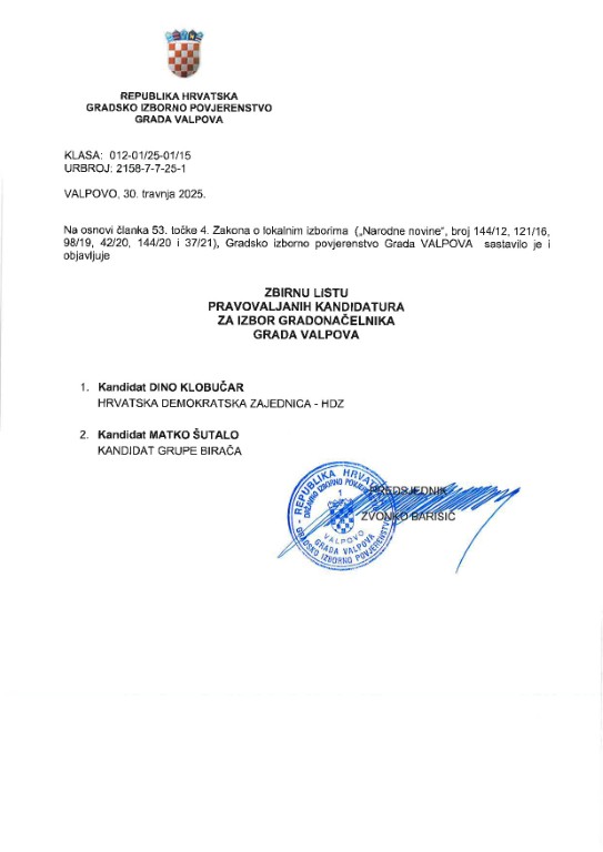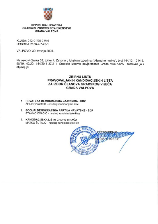VALPOVO Predsjednik Gradskog izbornog povjerenstva grada Valpova, Zvonko Barišić obavijestio je javnost o kandidacijskim listama i kandidaturama na području Grada Valpova.