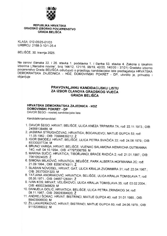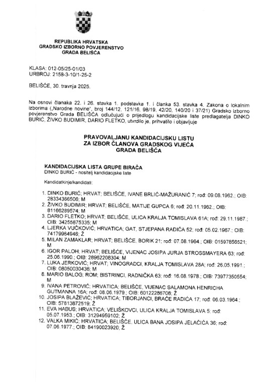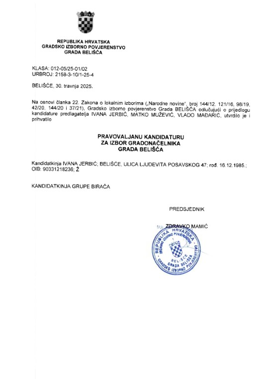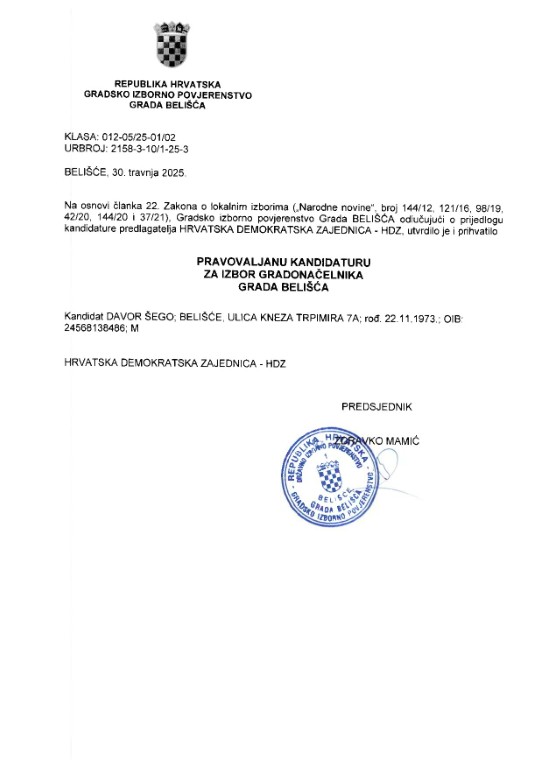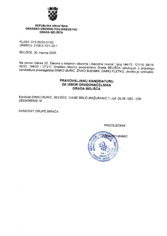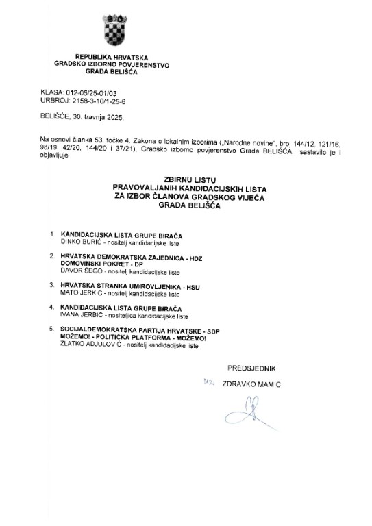 BELIŠĆE Predsjednik Gradskog. izbornog povjerenstva grada Belišća, Zdravko Mamić obavijestio je javnost o kandidacijskim listama i kandidaturama na području Grada Belišća.