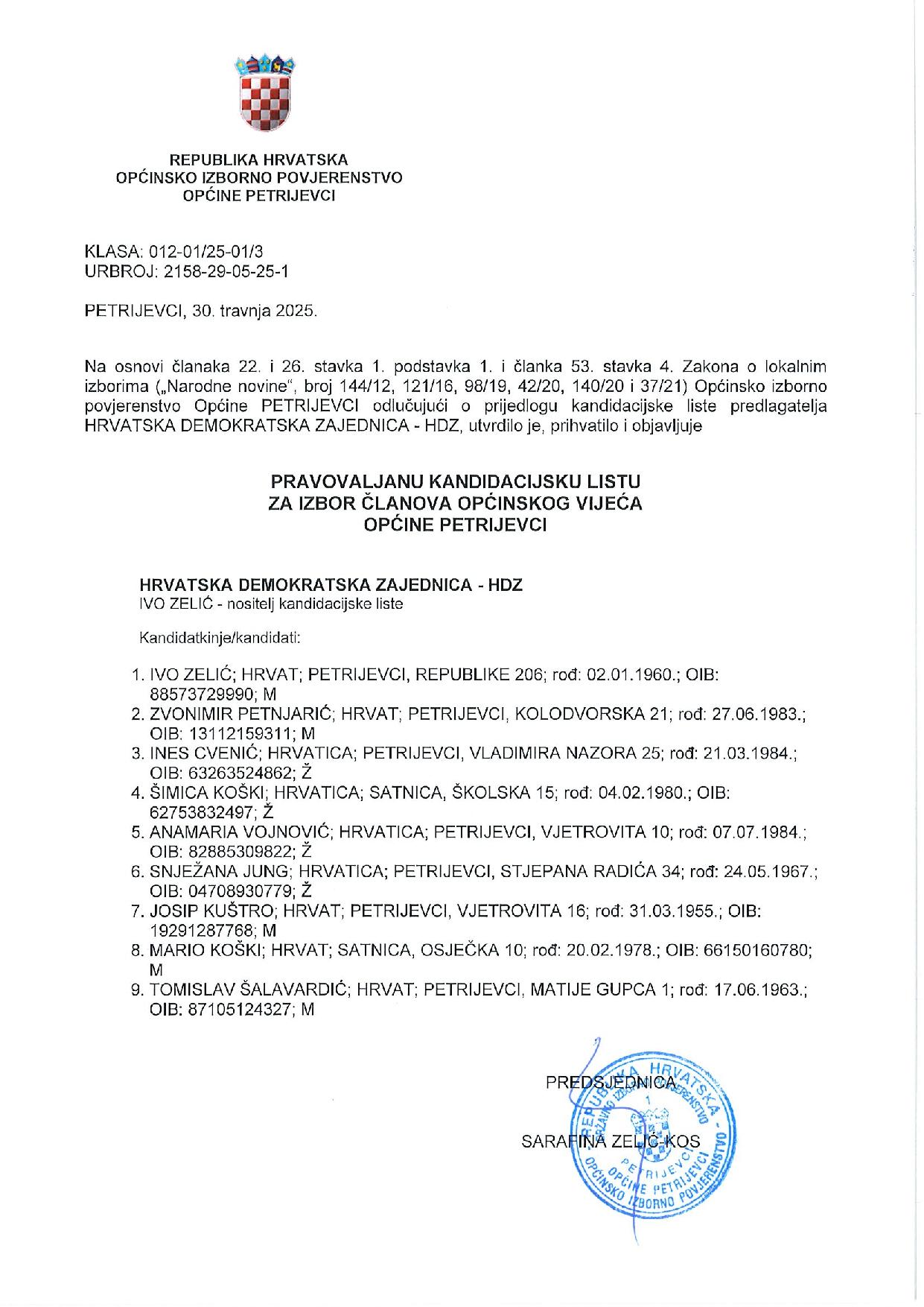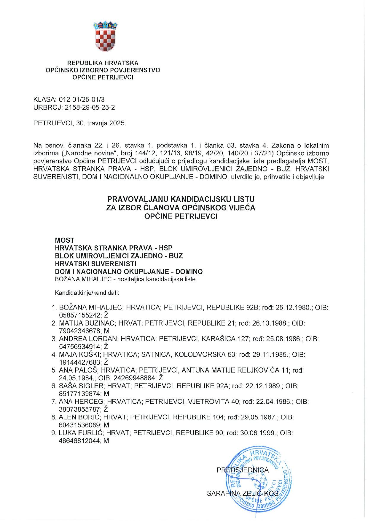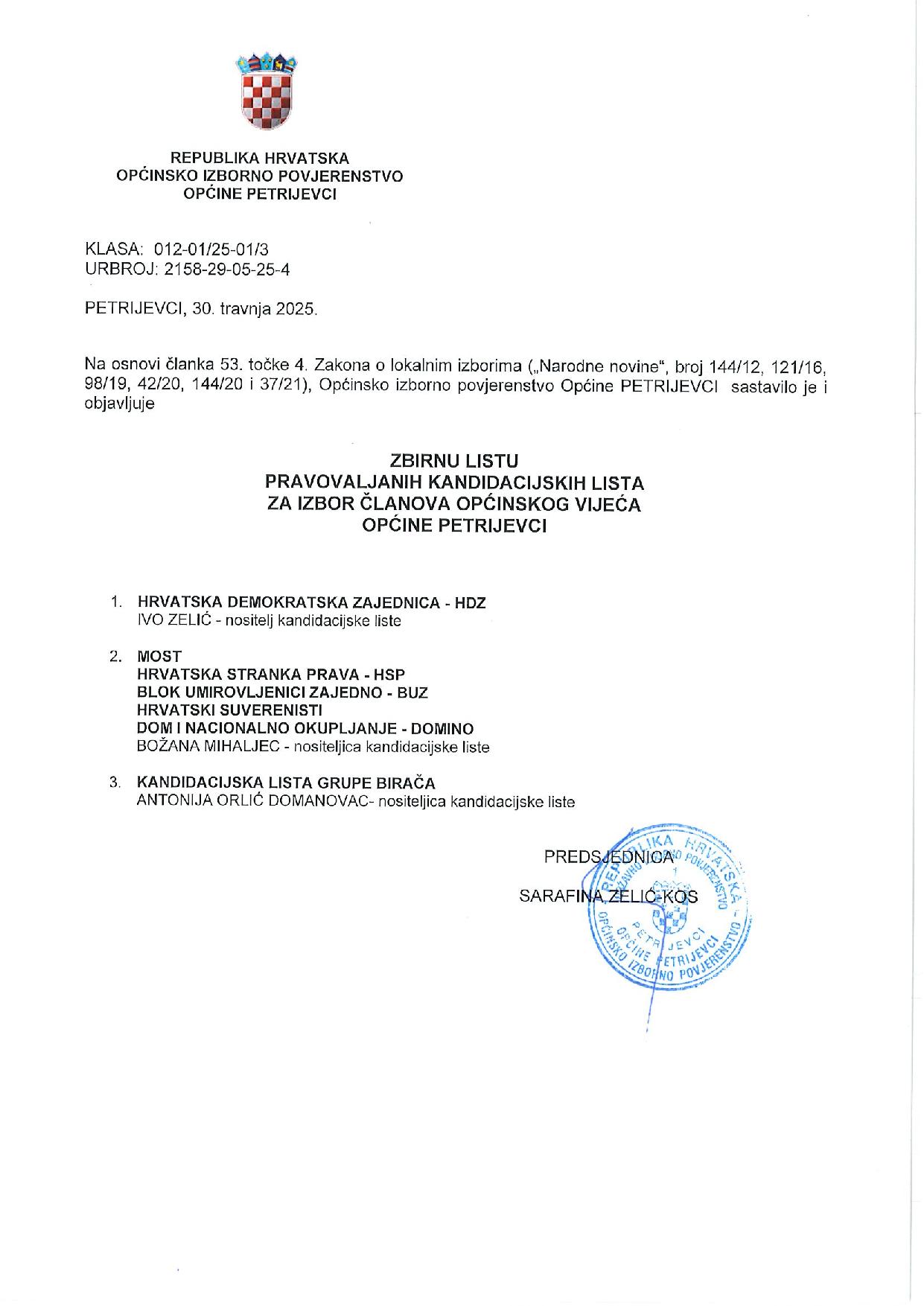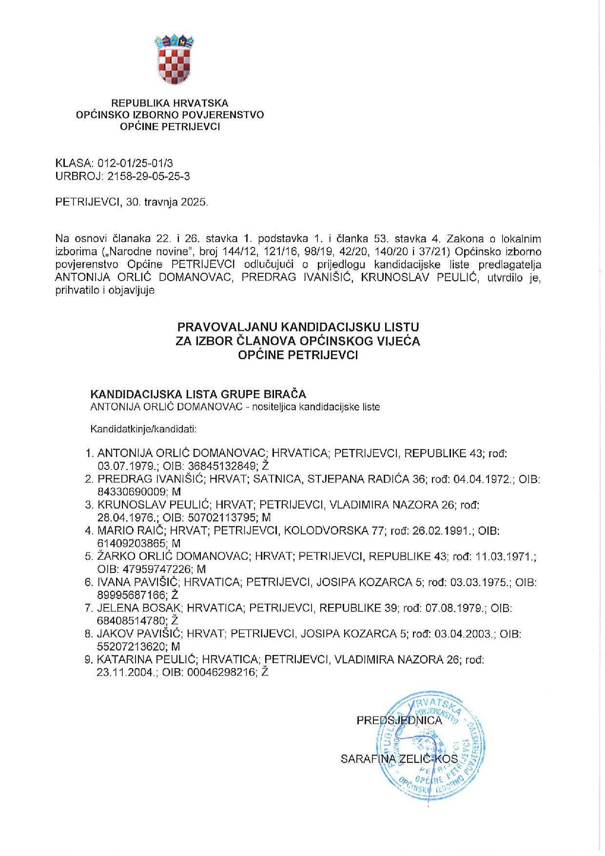 PETRIJEVCI Predsjednica Općinskog izbornog povjerenstva Općine Petrijevci, Sara Zelić Kos, obavijestila je javnost o kandidacijskim listama i kandidaturama na području Općine Petrijevci.