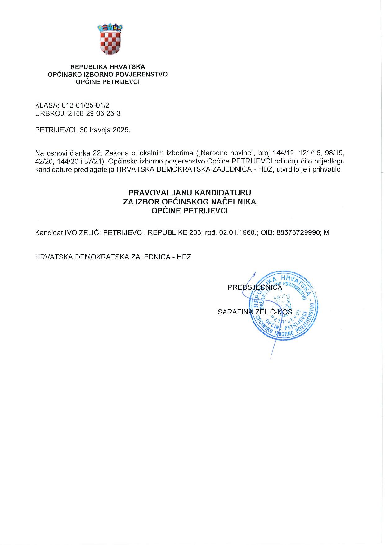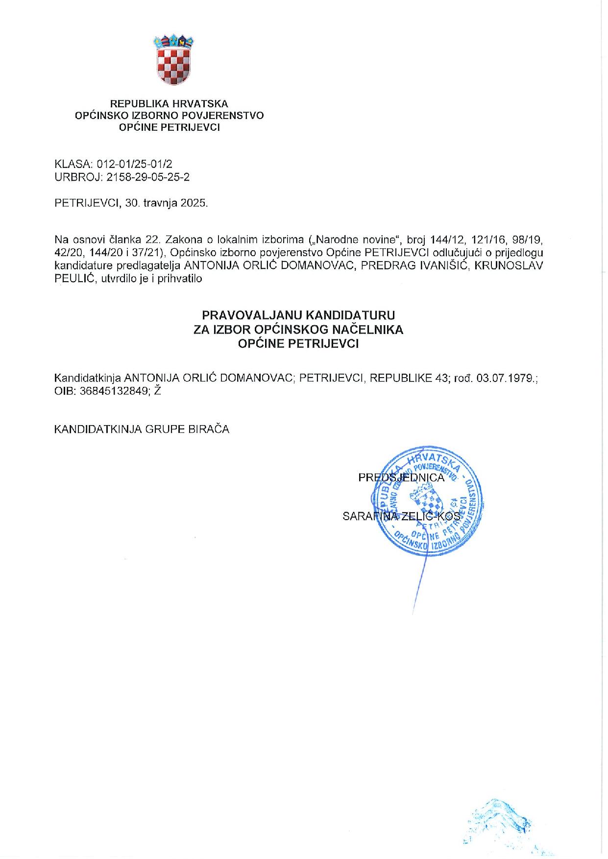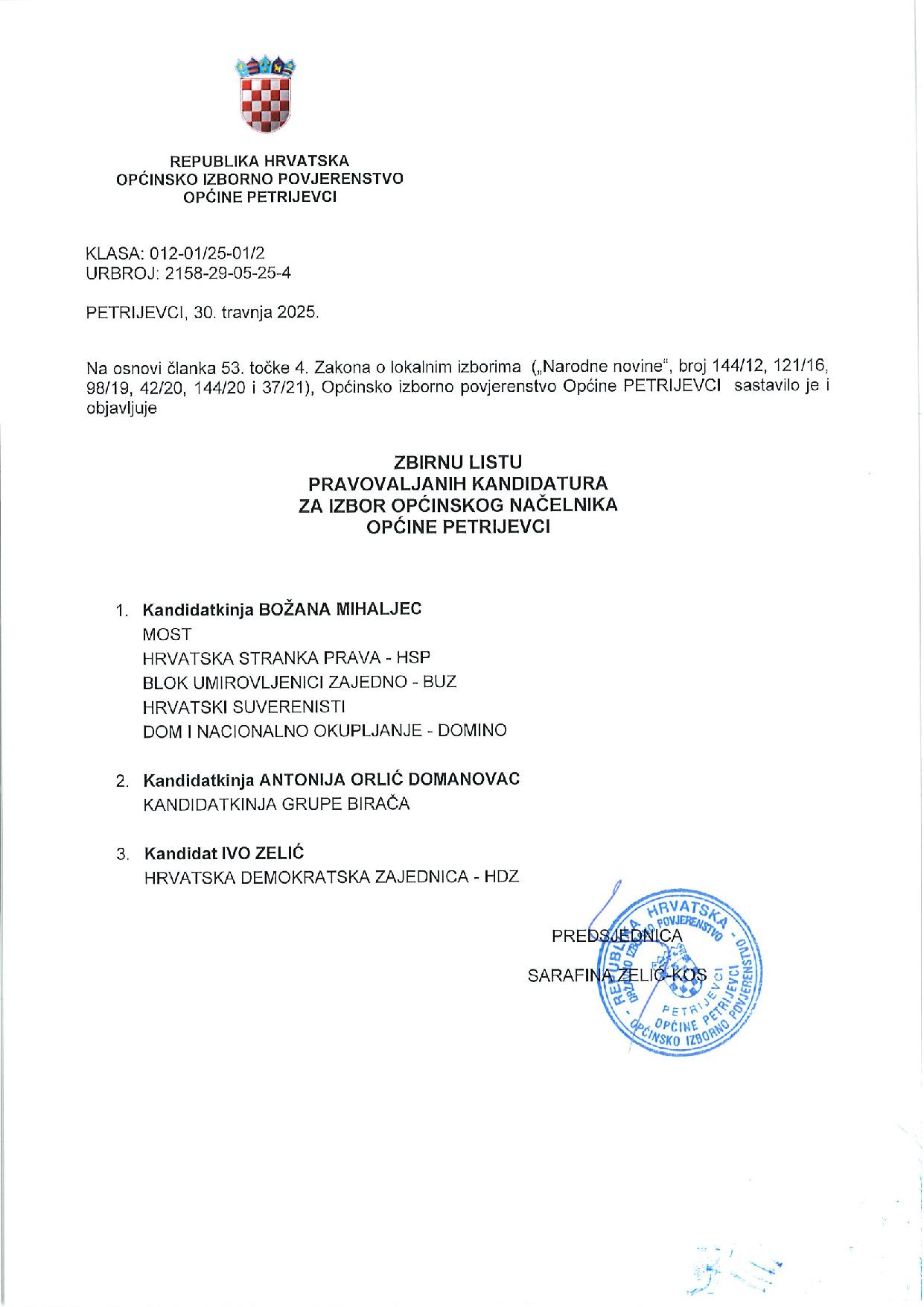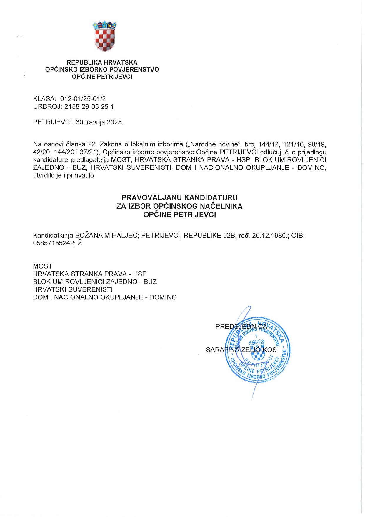 PETRIJEVCI Predsjednica Općinskog izbornog povjerenstva Općine Petrijevci, Sara Zelić Kos, obavijestila je javnost o kandidacijskim listama i kandidaturama na području Općine Petrijevci.