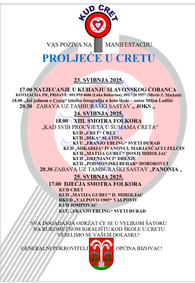 CRET BIZOVAČKI Kulturno umjetničko društvo Cret, pod pokroviteljstvom Općine Bizovac, organizira manifestaciju Proljeće u Cretu.