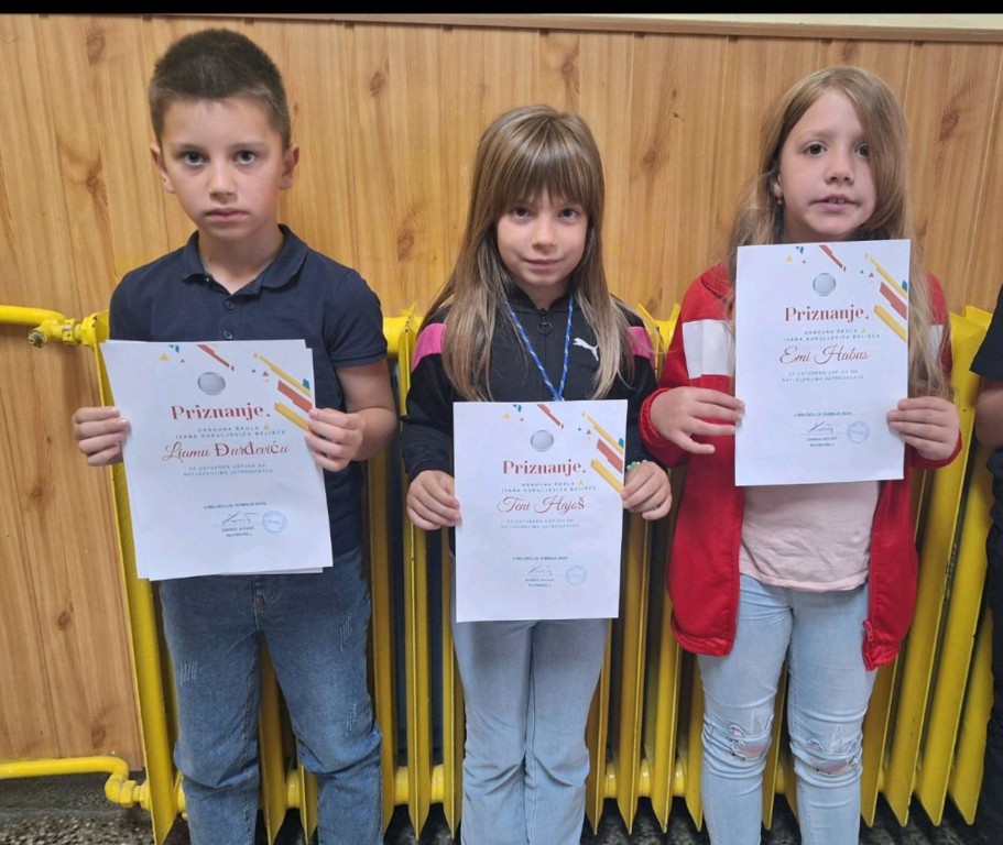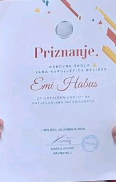 Priznanje škole povodom Dana Osnovne škole „Ivana Kukuljevića“ Belišće, 29.05.2025. godine, dodijeljena su Eni Habus, Teni Hajoš i Liamu Đurđević za aktivno sudjelovanje na vatrogasnim vježbama i natjecanjima, gdje im ovim putem čestitamo.
