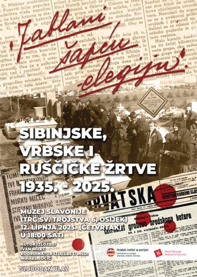 Otvorenje izložbe i predavanje dr.sc. Ivana Mileca (Hrvatski institut za povijest – Podružnica za povijest Slavonije, Srijema i Baranje) održat će se 12. lipnja 2025. godine (četvrtak) s početkom u 18:00 sati u Muzeju Slavonije (Trg Sv. Trojstva 6, Osijek). Ulaz je slobodan.