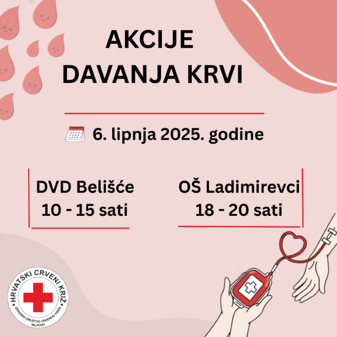 Podsjećamo sve koji nisu uspjeli doći u Valpovo na akciju davanja krvi da mogu doći u petak, 6. lipnja 2025. godine u DVD Belišće od 10 do 15 sati ili u OŠ Ladimirevci od 18 do 20 sati.