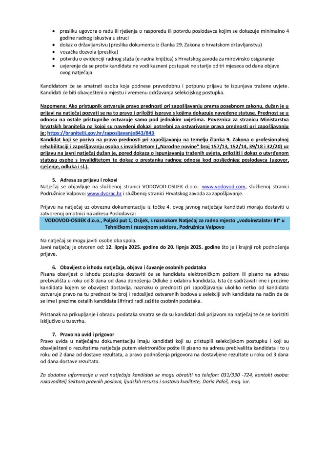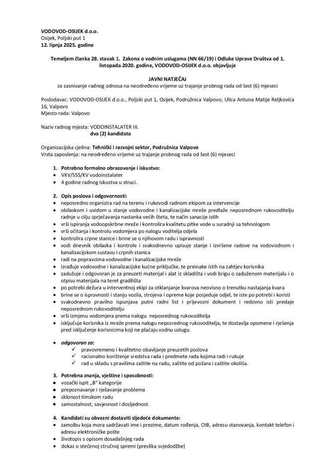 VALPOVO VODOVOD-OSIJEK d.o.o., Podružnica Valpovo, raspisala je Natječaj za zasnivanje radnog odnosa - VODOINSTALATER III u Podružnici Valpovo, dva (2) kandidata.