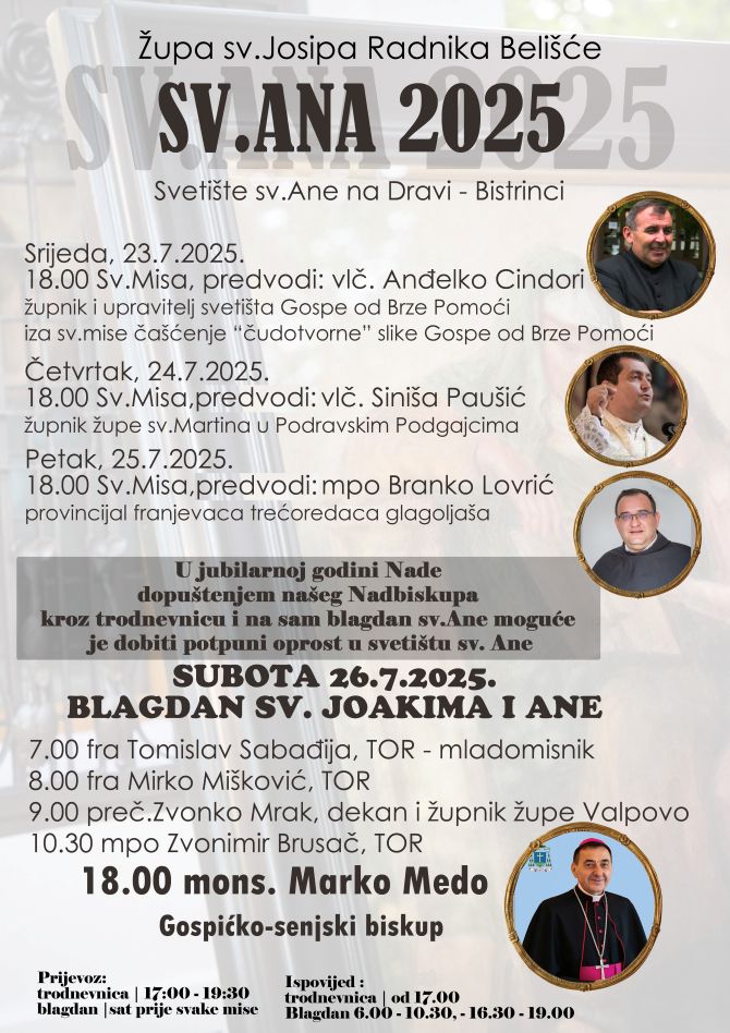 BISTRINCI Župa svetog Josipa Radnika u Belišću organizira proslavu blagdana svete Ane u istoimenom svetištu u Bistrincima, priopćeno je iz Župe Belišće.