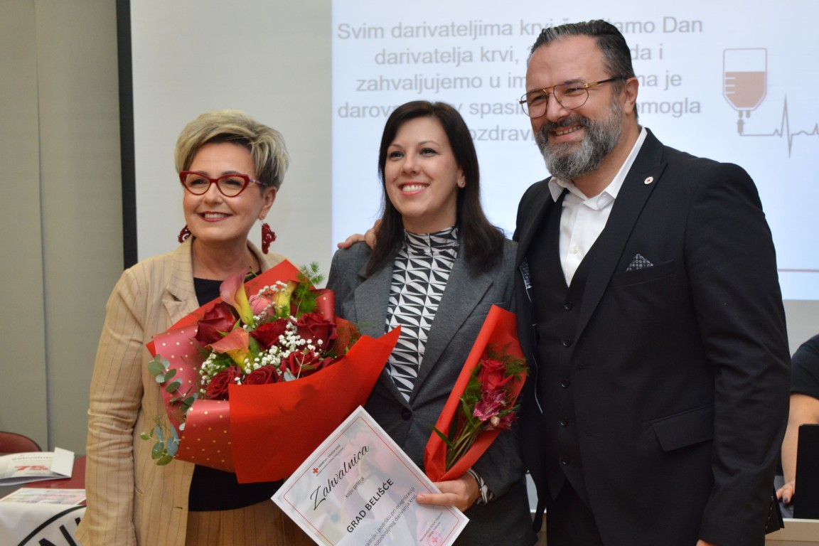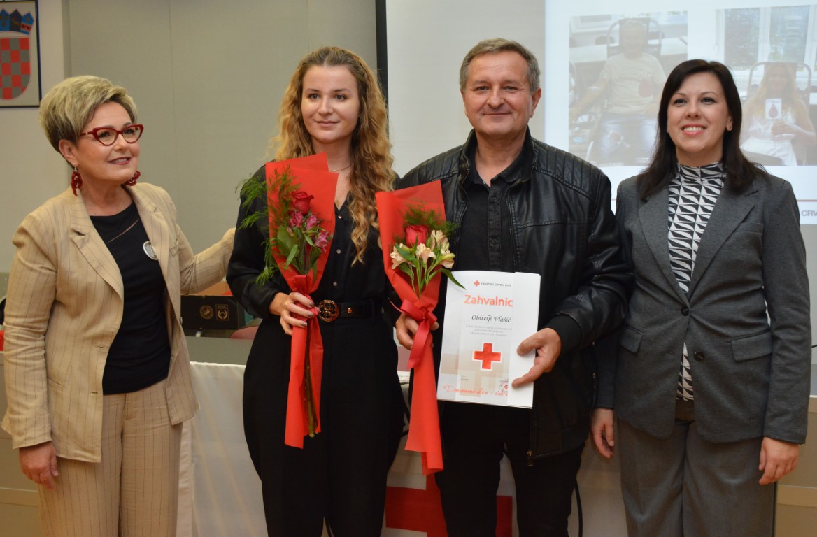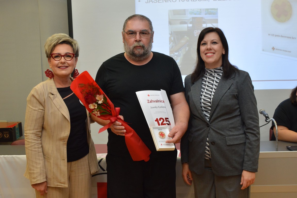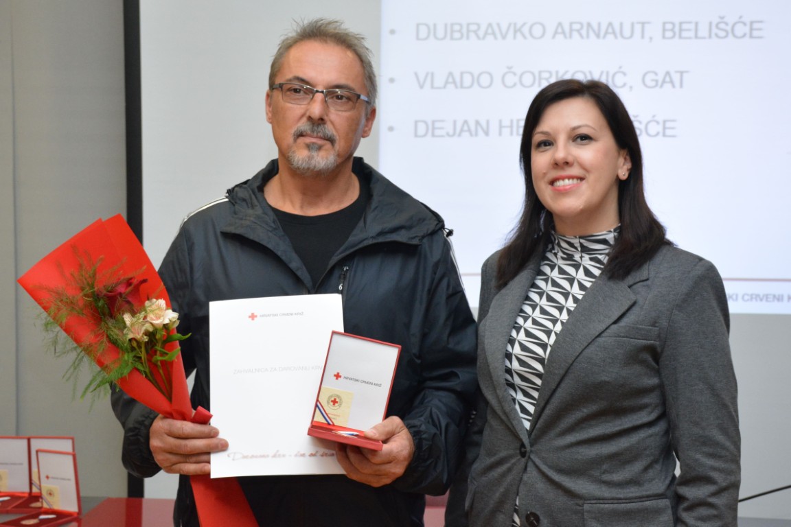 zahvalnicu i plaketu Hrvatskog Crvenog križa za izvanredan uspjeh - 125 puta darovanu krv JASENKO KARDUM, BELIŠĆE (126 DAVANJA) te obiteljsku zahvalnicu MARIN I TINA VLAŠIĆ (OTAC I KĆI), Baranjsko Petrovo Selo (60 i 26 DAVANJA).