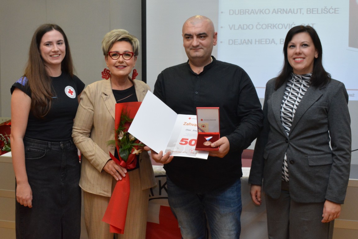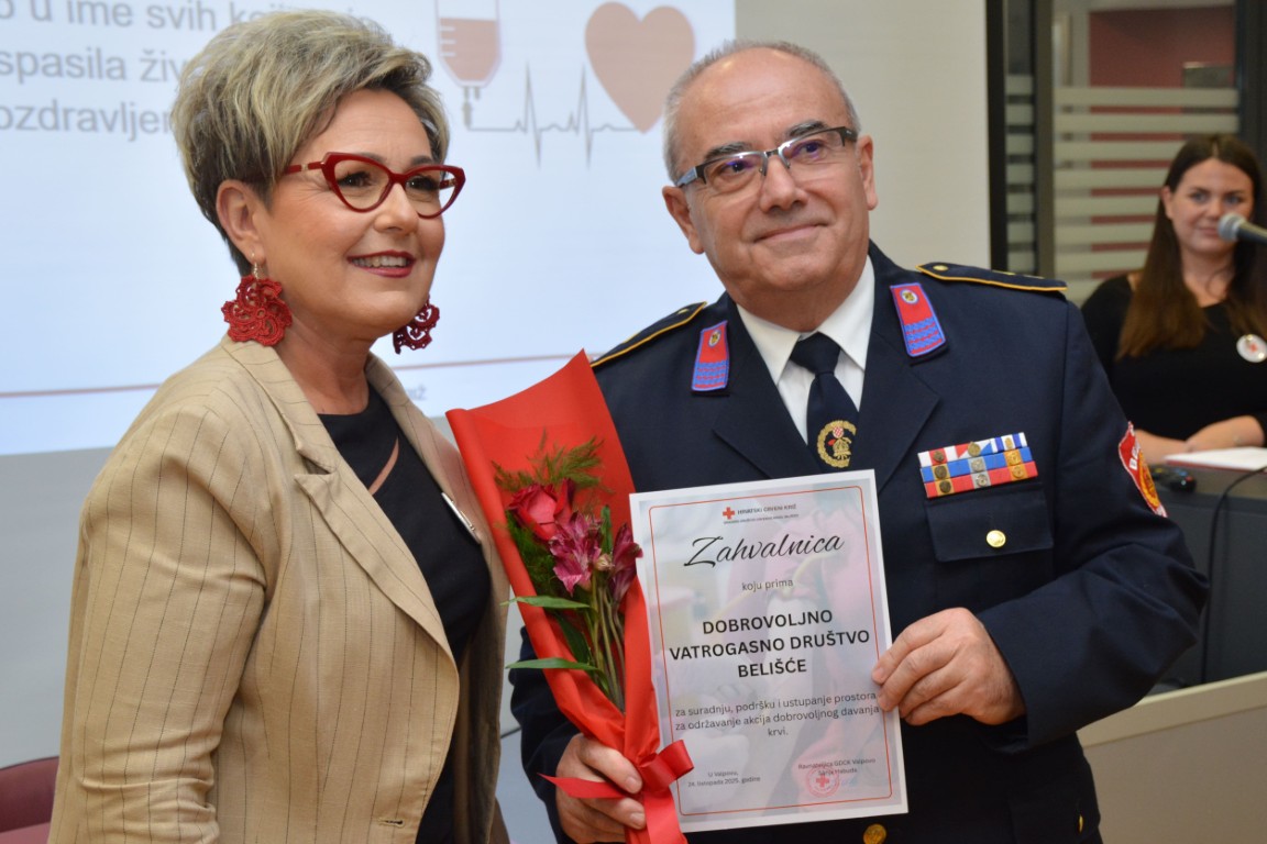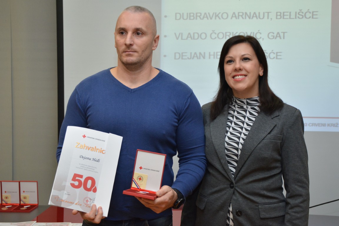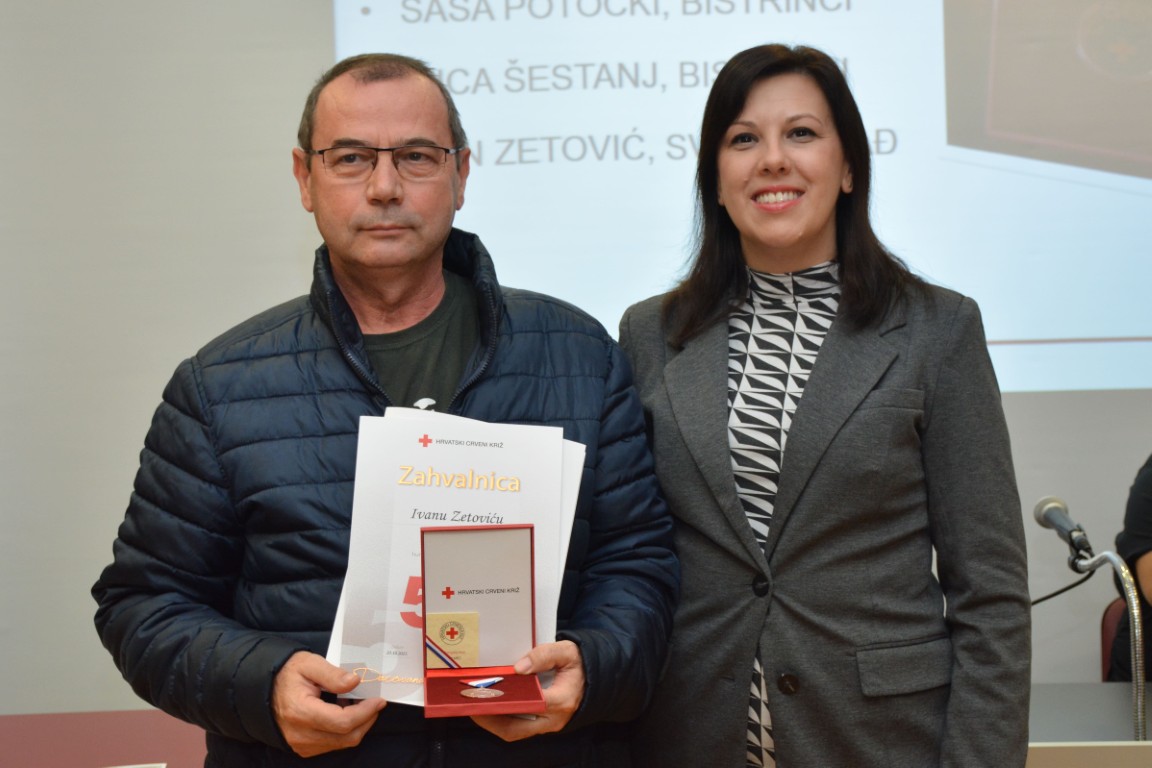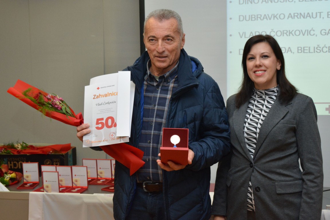 zahvalnicu i plaketu Hrvatskog Crvenog križa za izvanredan uspjeh - 125 puta darovanu krv JASENKO KARDUM, BELIŠĆE (126 DAVANJA) te obiteljsku zahvalnicu MARIN I TINA VLAŠIĆ (OTAC I KĆI), Baranjsko Petrovo Selo (60 i 26 DAVANJA).