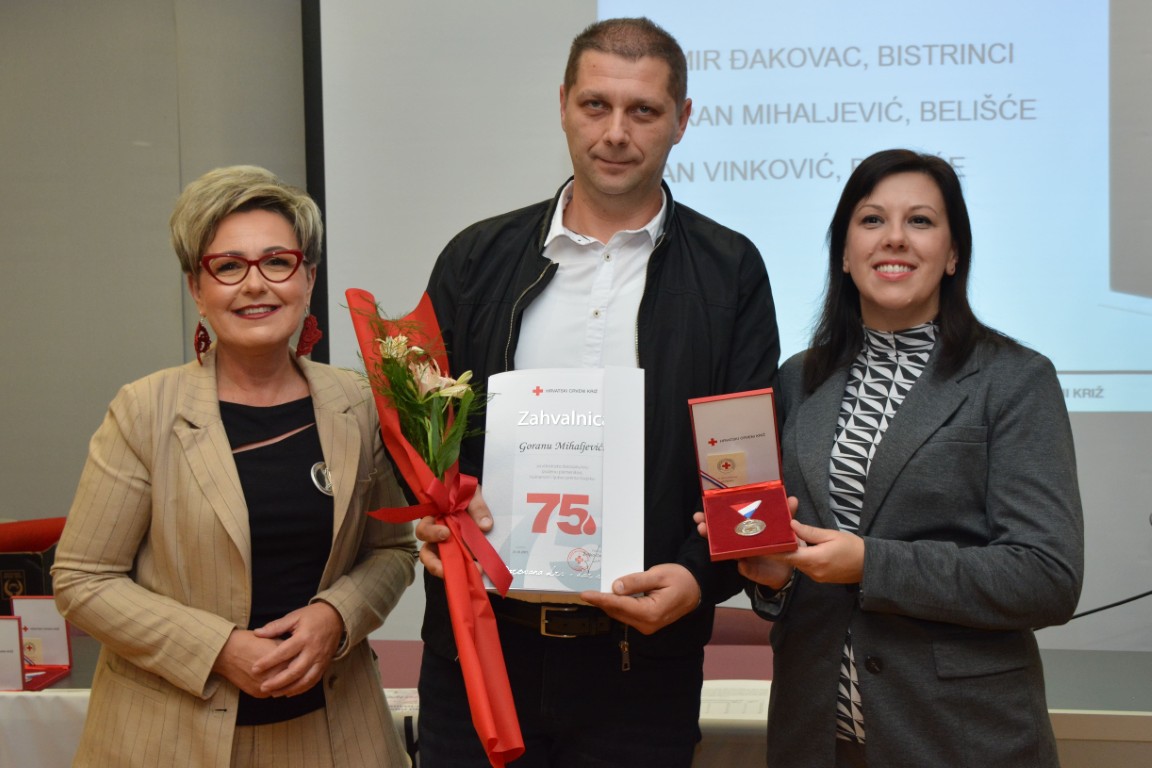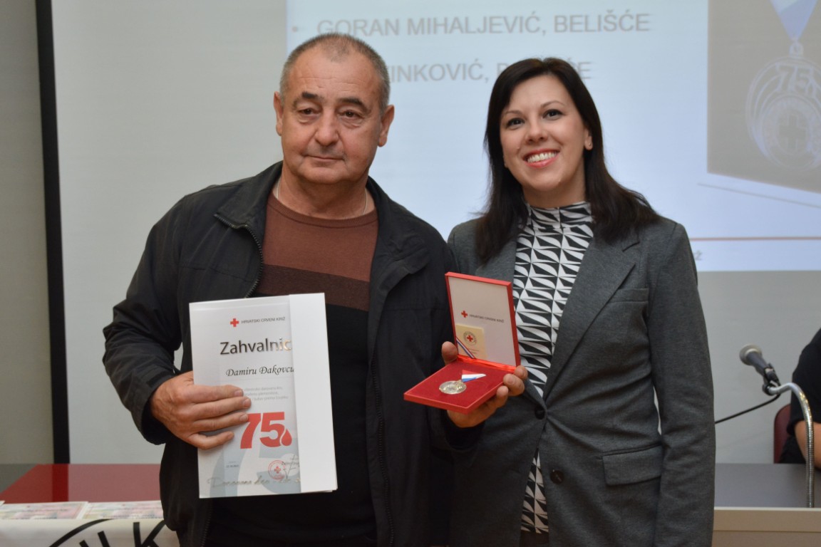 zahvalnicu i srebrni znak priznanja Hrvatskog Crvenog križa za 75 puta darovanu krv • DAMIR ĐAKOVAC, BISTRINCI (80 DAVANJA), GORAN MIHALJEVIĆ, BELIŠĆE (76 DAVANJA), RANKO PEJIĆ, BISTRINCI (84 DAVANJA) i IVAN VINKOVIĆ, BELIŠĆE (87 DAVANJA),