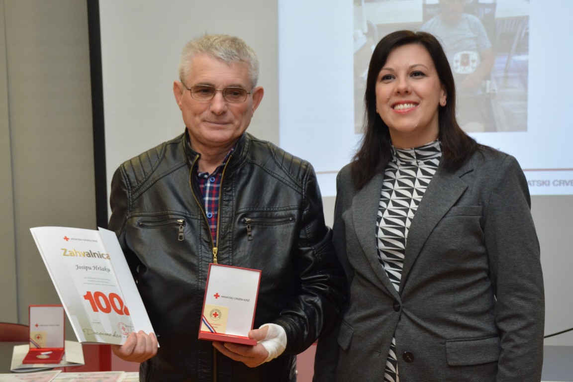 zahvalnicu i zlatni znak priznanja Hrvatskog Crvenog križa za 100 puta darovanu krv JOSIP HRŠAK, VELIŠKOVCI (100 DAVANJA),