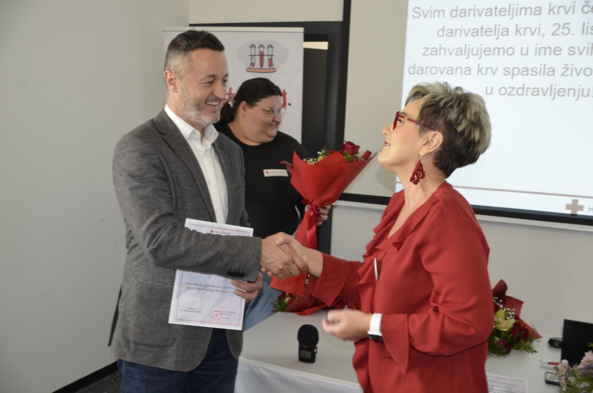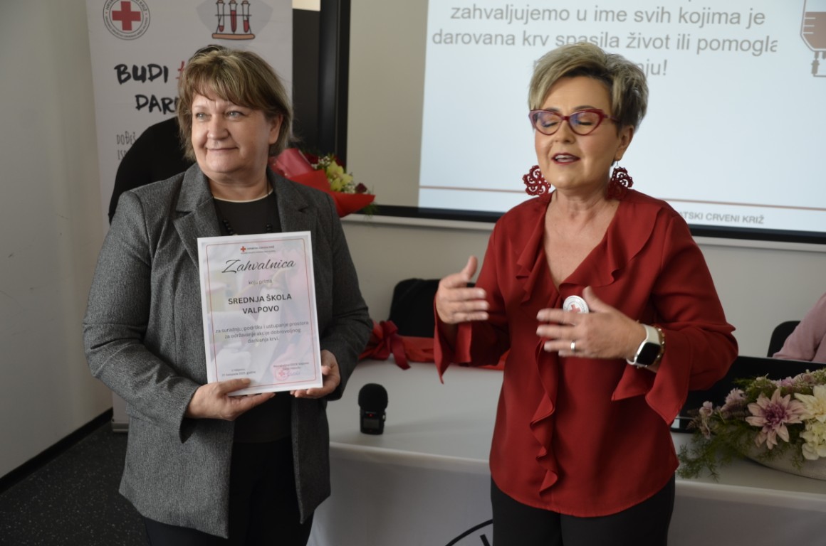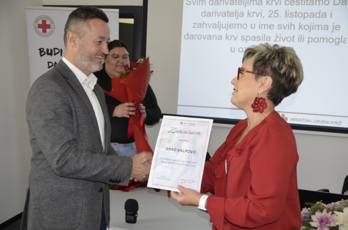 U nastavku, ravnateljica Gradskog društva crvenog križa Sanja Habuda je uručila prigodne zahvalnice i gradonačelniku Matku Šutalu, Svjetlani Kalpić i Dori Janjić za primjerenu suradnju u organizaciji i provođenju akcija dobrovoljnog darivanja krvi, ali i u svim ostalim aktivnostima koje provodi Gradsko društvo Crvenog križa Valpovo.