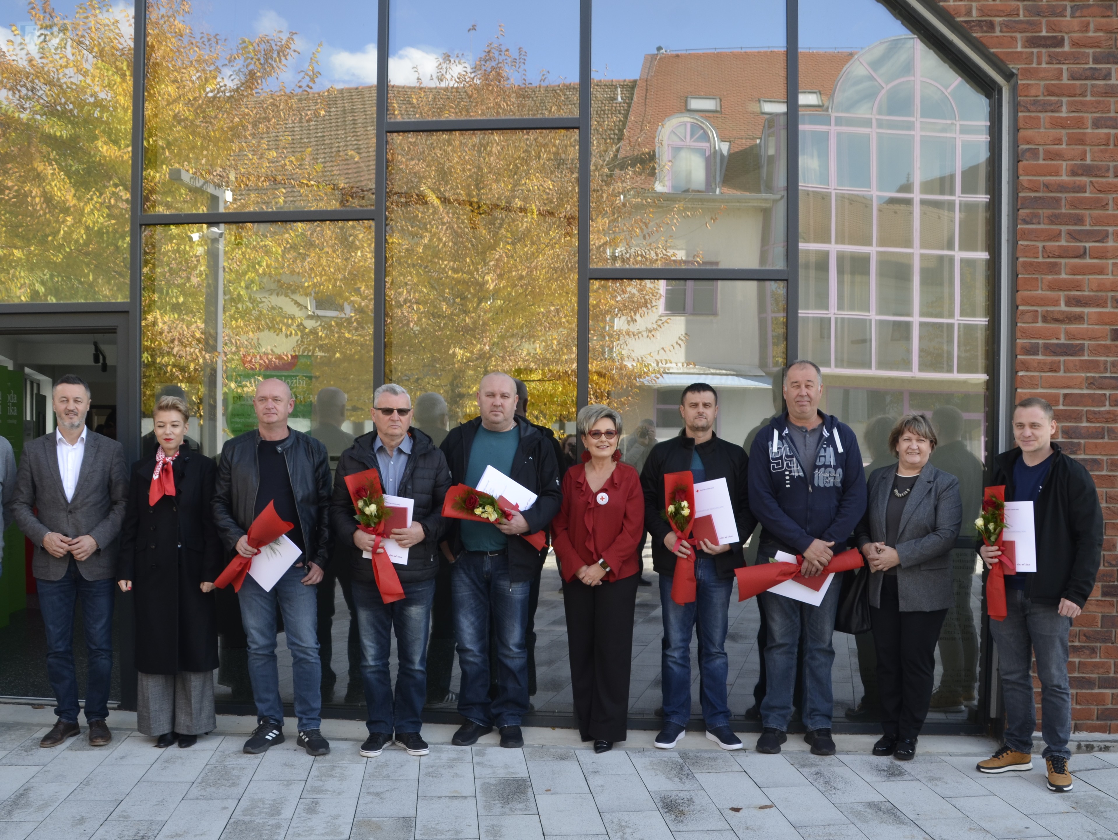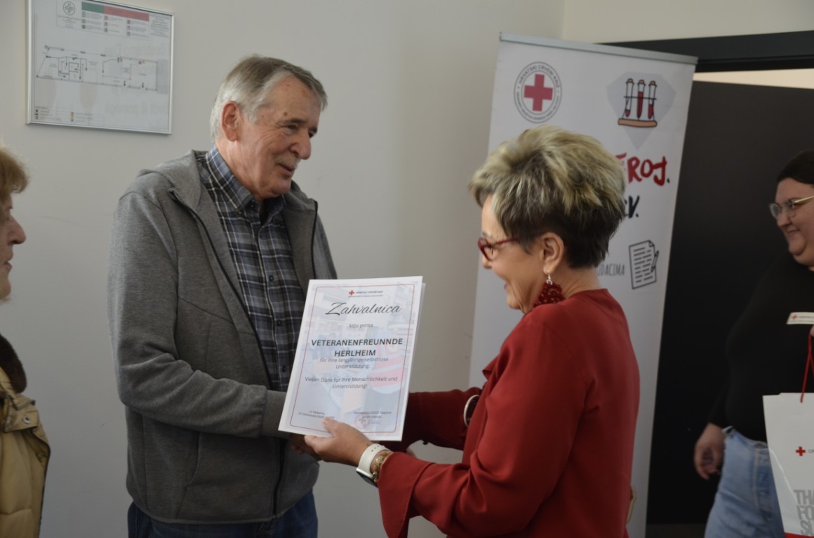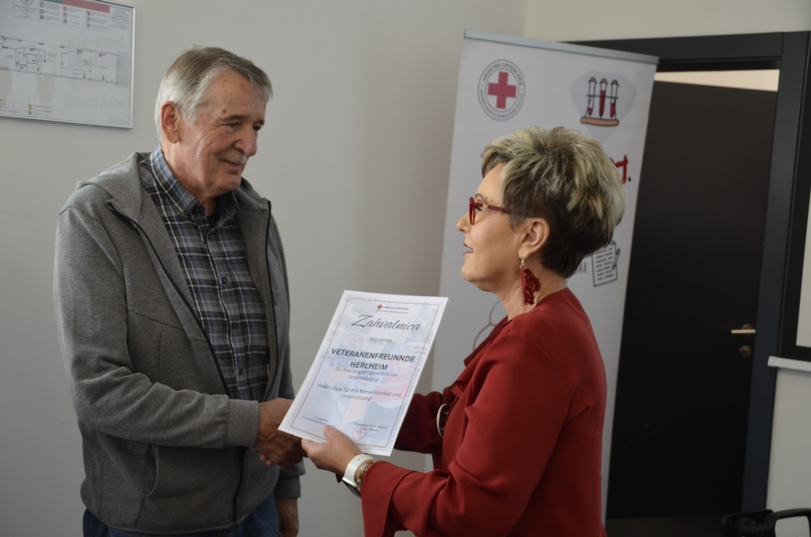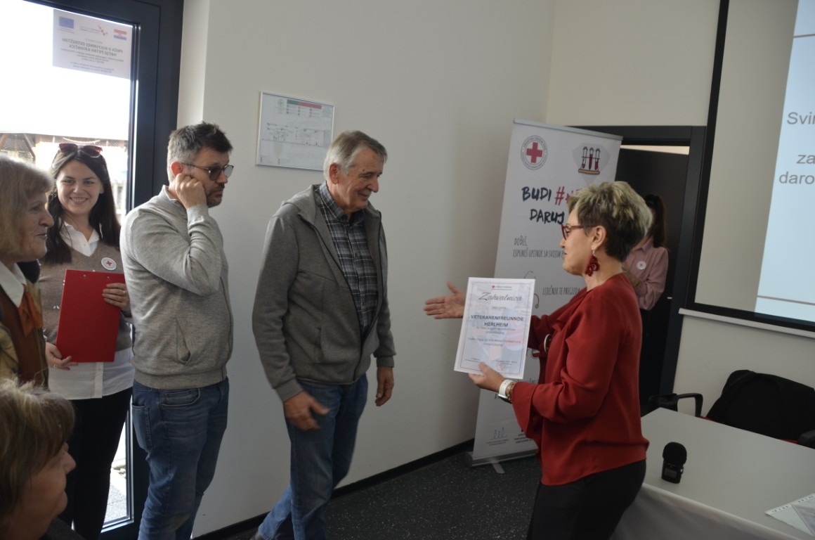 Današnja svečanost uručenja zahvalnica višestrukim darivateljima krvi doživjela je vrhunac kada su u Memorijalni centar Matije Petra Katančića došli humanitarci iz Herlhema. Albin, Ewald i Mathias Kopp, koji su se tijekom prijepodneva družili s članovima Udruge MI, kojima su donijeli novu pošiljku humanitarne pomoći.