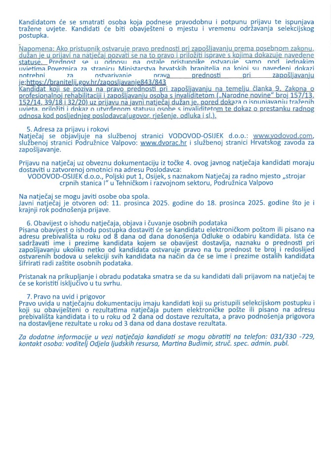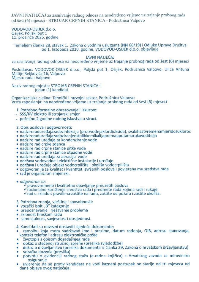 VALPOVO VODOVOD-OSIJEK d.o.o. Podružnica Valpovo raspisala je Natječaj za zasnivanje radnog odnosa - STROJAR CRPNIH STANICA I u Podružnici Valpovo (1 kandidat).