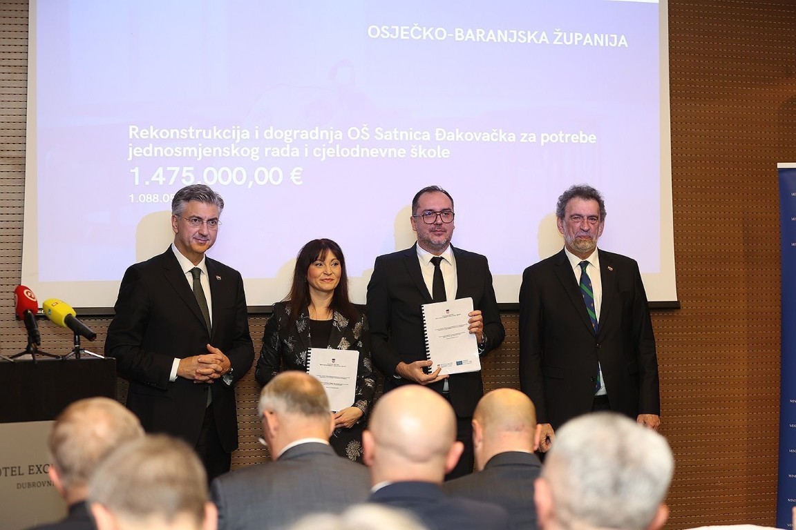 Na sastanku s Vladom Republike Hrvatske, održanom u Dubrovniku, potpisano je sedam ugovora o dodjeli bespovratnih sredstava za projekte izgradnje, dogradnje i opremanja osnovnih škola na području Osječko-baranjske županije, ukupne vrijednosti 26,3 milijuna eura.