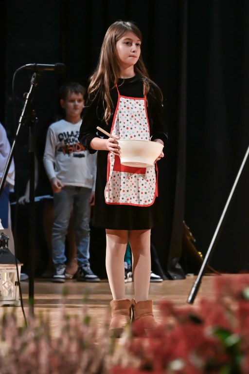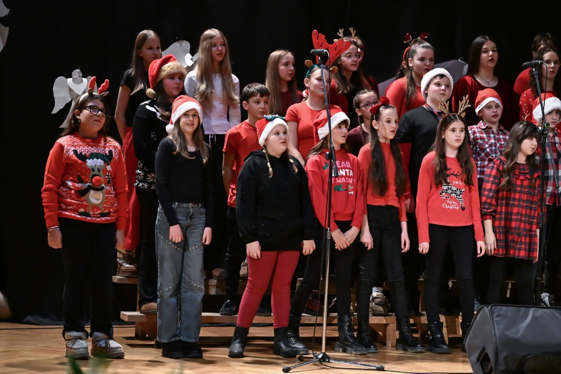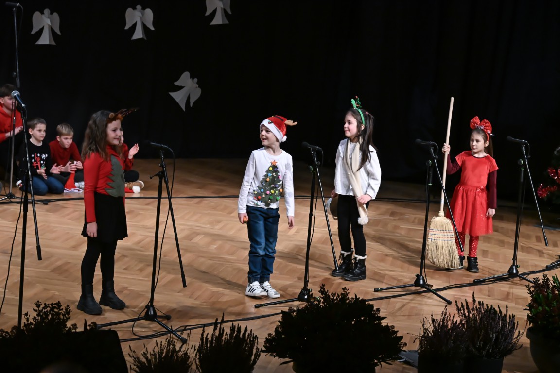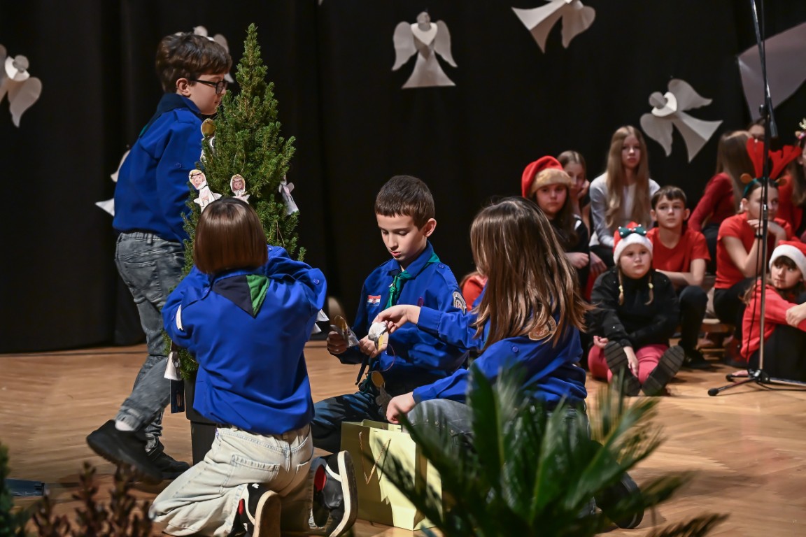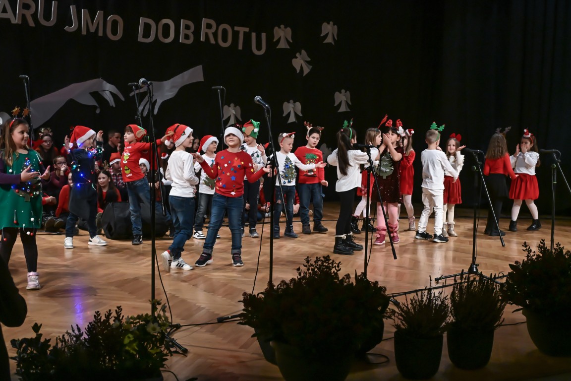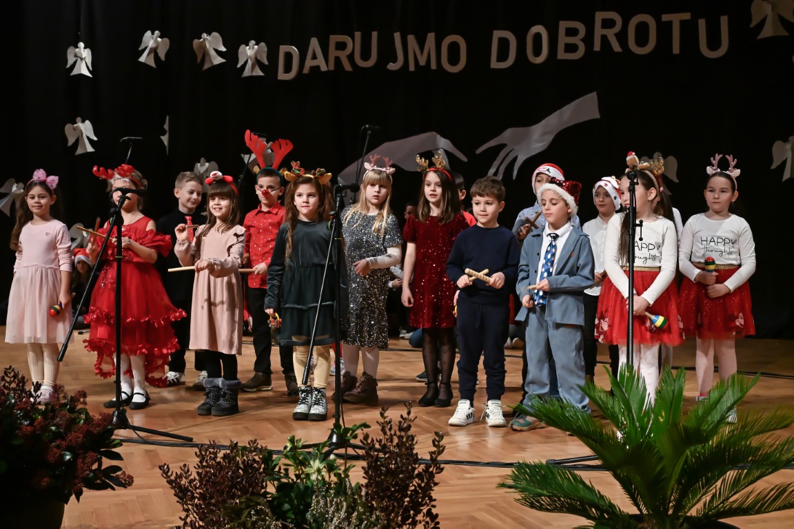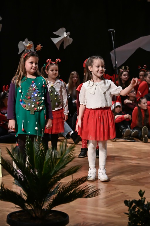 Pod vodstvom Tie i Mie redali su se školski zbor uz vodstvo učiteljice Maje Huis i soliste Mariju Marčeta i Benjamina Bencak, učenici 1. a razreda, koji su uz mentorstvo učiteljice Vanje Bošnjak pripremili nekoliko recitacija, a uslijedila je glazbena točka 1. b razreda uz mentorstvo Ivane Andrić Pejak. Učenici 4. c razreda nastupili su uz igrokaz "Ljubav je najvažnija" koji su pripremili uz mentorstvo učiteljice Biserke Medved, učenici 2. b razreda koji su uz podršku učiteljice Sanele Čuljak pripremili nekoliko recitacija i jedan mali igrokaz pod naslovom "Mačka i božićno drvce", a nakon njih učenici 2. a razreda uz mentorstvo učiteljice Vanese Hegeduš. Učenici 4. d razreda s učiteljicom Jadrankom Ivić pripremili su igrokaz "Betlehemski pastiri klanjaju se Spasitelju". Bruna Mihalj izvela je monolog Sanje Slivar „Kroz penđer“, Vita Jugović nastupila je s pjesmom Walking in the air, a vedrinu i toplinu unijeli su učenici 3. a razreda i učiteljica Senka Špoljarić igrokazom "Nova godina".