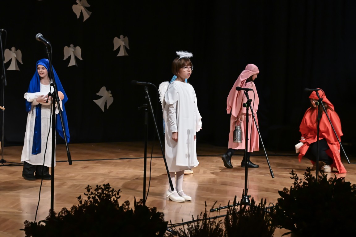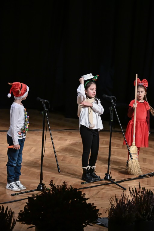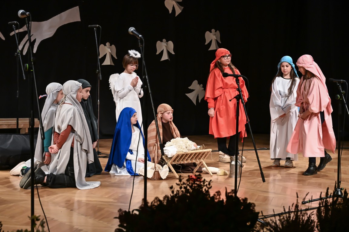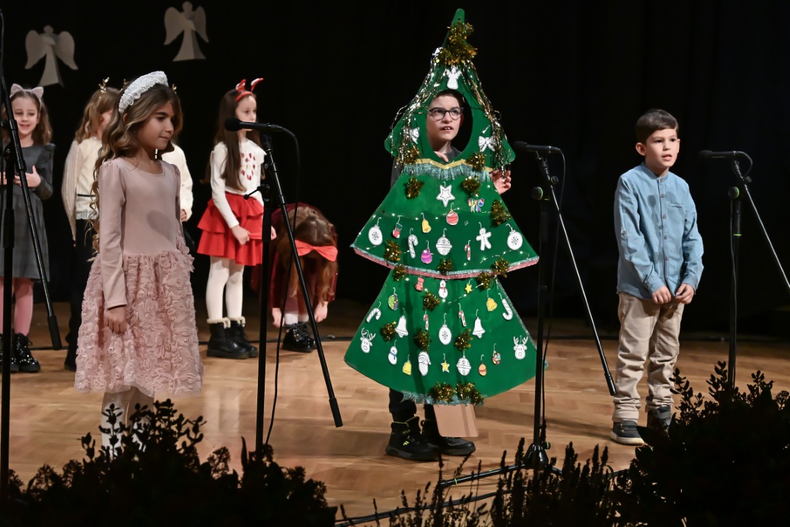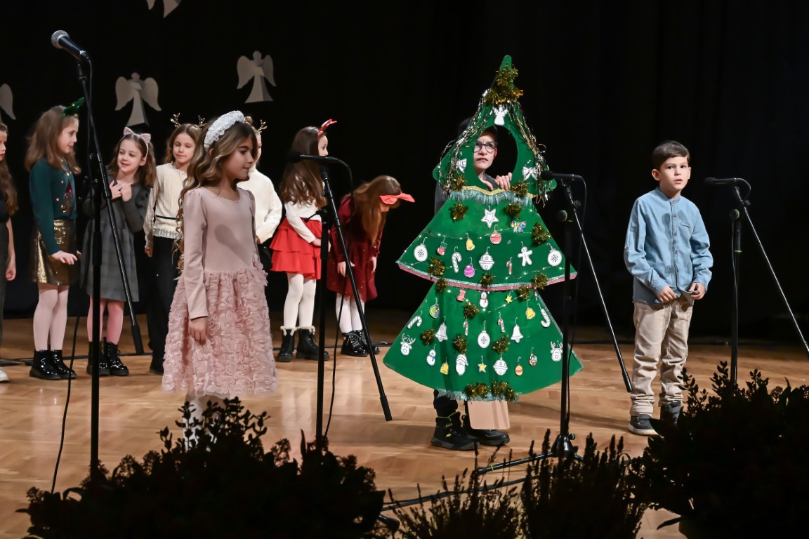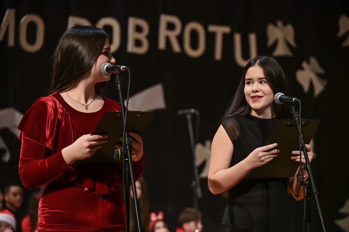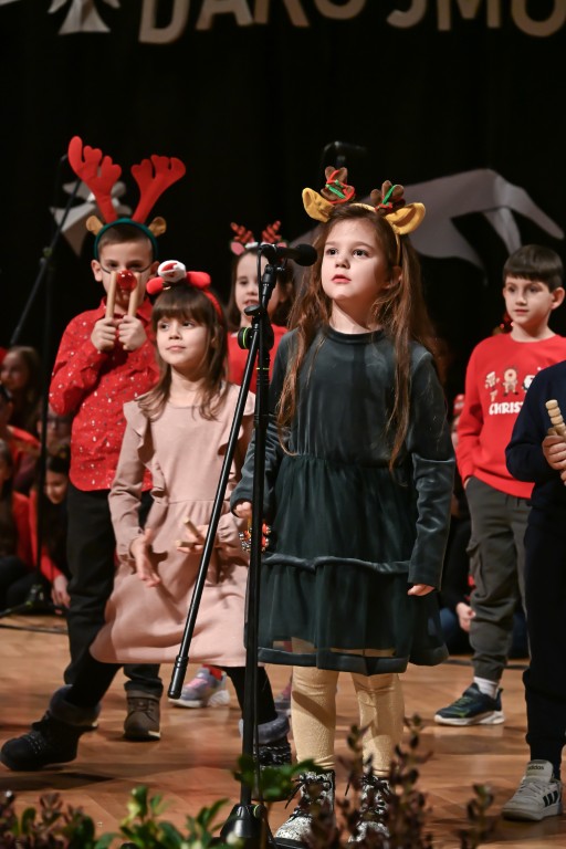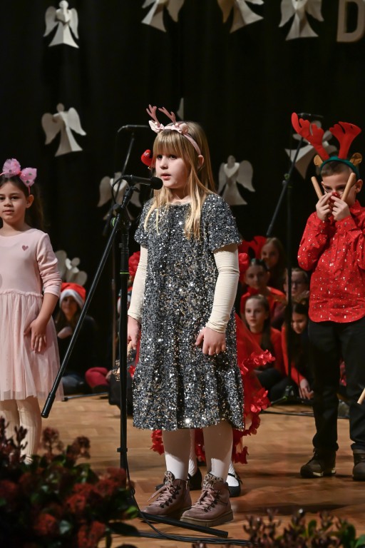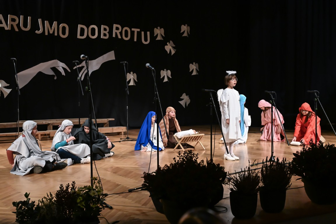 Pod vodstvom Tie i Mie redali su se školski zbor uz vodstvo učiteljice Maje Huis i soliste Mariju Marčeta i Benjamina Bencak, učenici 1. a razreda, koji su uz mentorstvo učiteljice Vanje Bošnjak pripremili nekoliko recitacija, a uslijedila je glazbena točka 1. b razreda uz mentorstvo Ivane Andrić Pejak. Učenici 4. c razreda nastupili su uz igrokaz "Ljubav je najvažnija" koji su pripremili uz mentorstvo učiteljice Biserke Medved, učenici 2. b razreda koji su uz podršku učiteljice Sanele Čuljak pripremili nekoliko recitacija i jedan mali igrokaz pod naslovom "Mačka i božićno drvce", a nakon njih učenici 2. a razreda uz mentorstvo učiteljice Vanese Hegeduš. Učenici 4. d razreda s učiteljicom Jadrankom Ivić pripremili su igrokaz "Betlehemski pastiri klanjaju se Spasitelju". Bruna Mihalj izvela je monolog Sanje Slivar „Kroz penđer“, Vita Jugović nastupila je s pjesmom Walking in the air, a vedrinu i toplinu unijeli su učenici 3. a razreda i učiteljica Senka Špoljarić igrokazom "Nova godina".