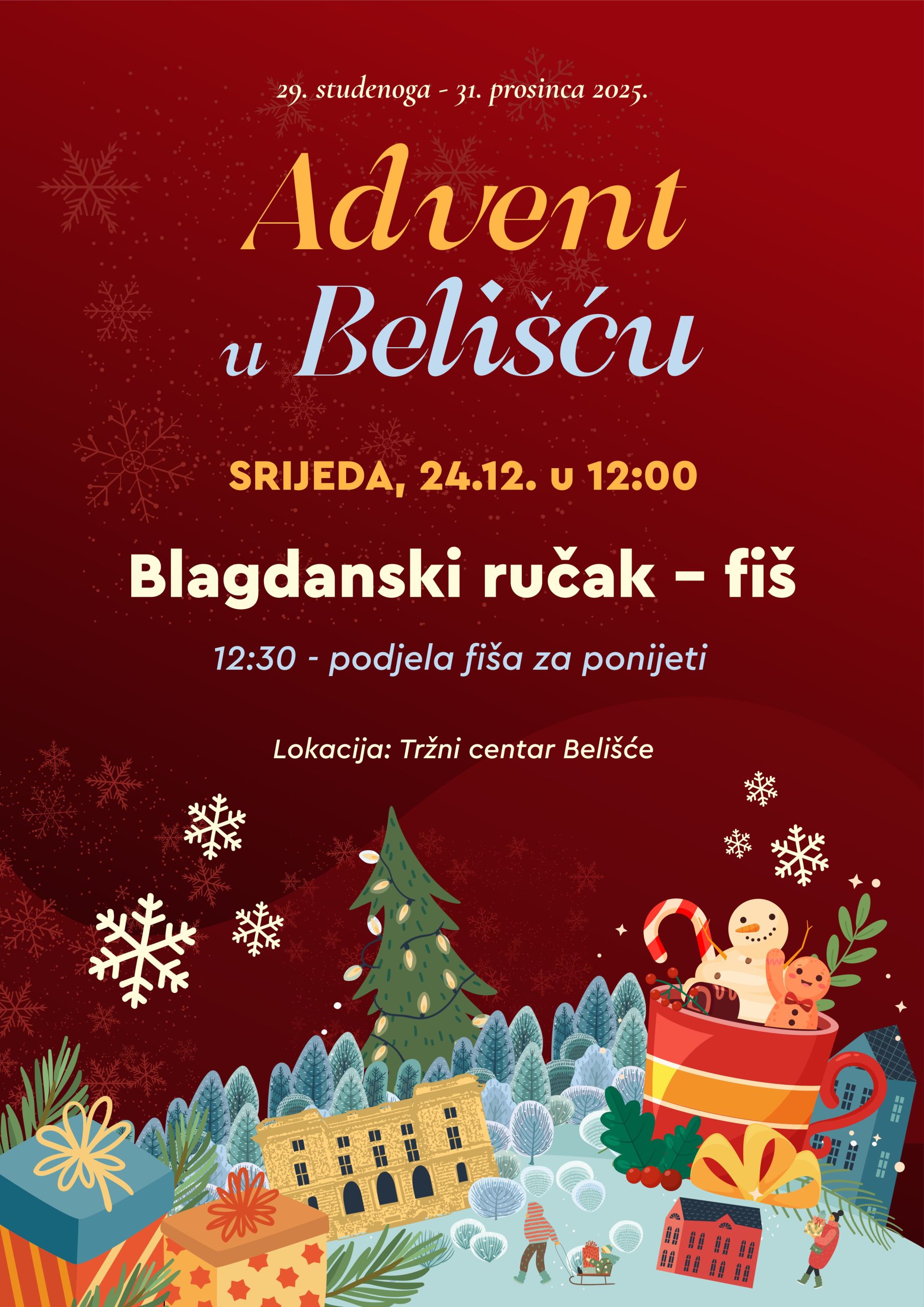 -Zbog predviđenih padalina, sutra na Badnjak, blagdanski ručak – fiš i podjela fiša za ponijeti, održat će se na Tržnom centru Belišće, a ne u adventskom prostoru kako je planirano i najavljeno, priopćili su danas prijepodne.